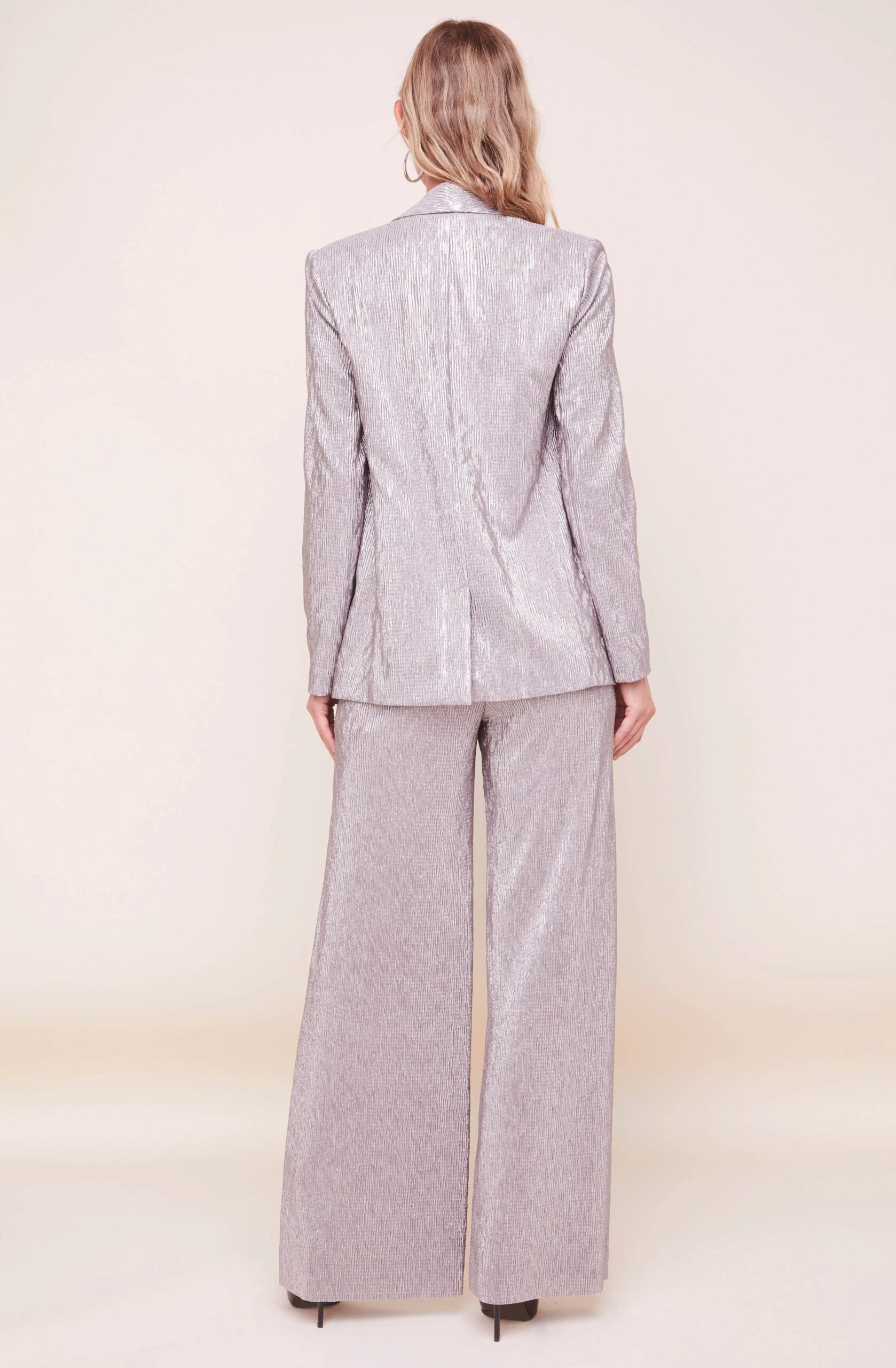 The holidays give you a reason to be chic! The Aileen Pants feature a sparkling metallic sheen with a high waist and wide leg bottoms. Slanted hip pockets.