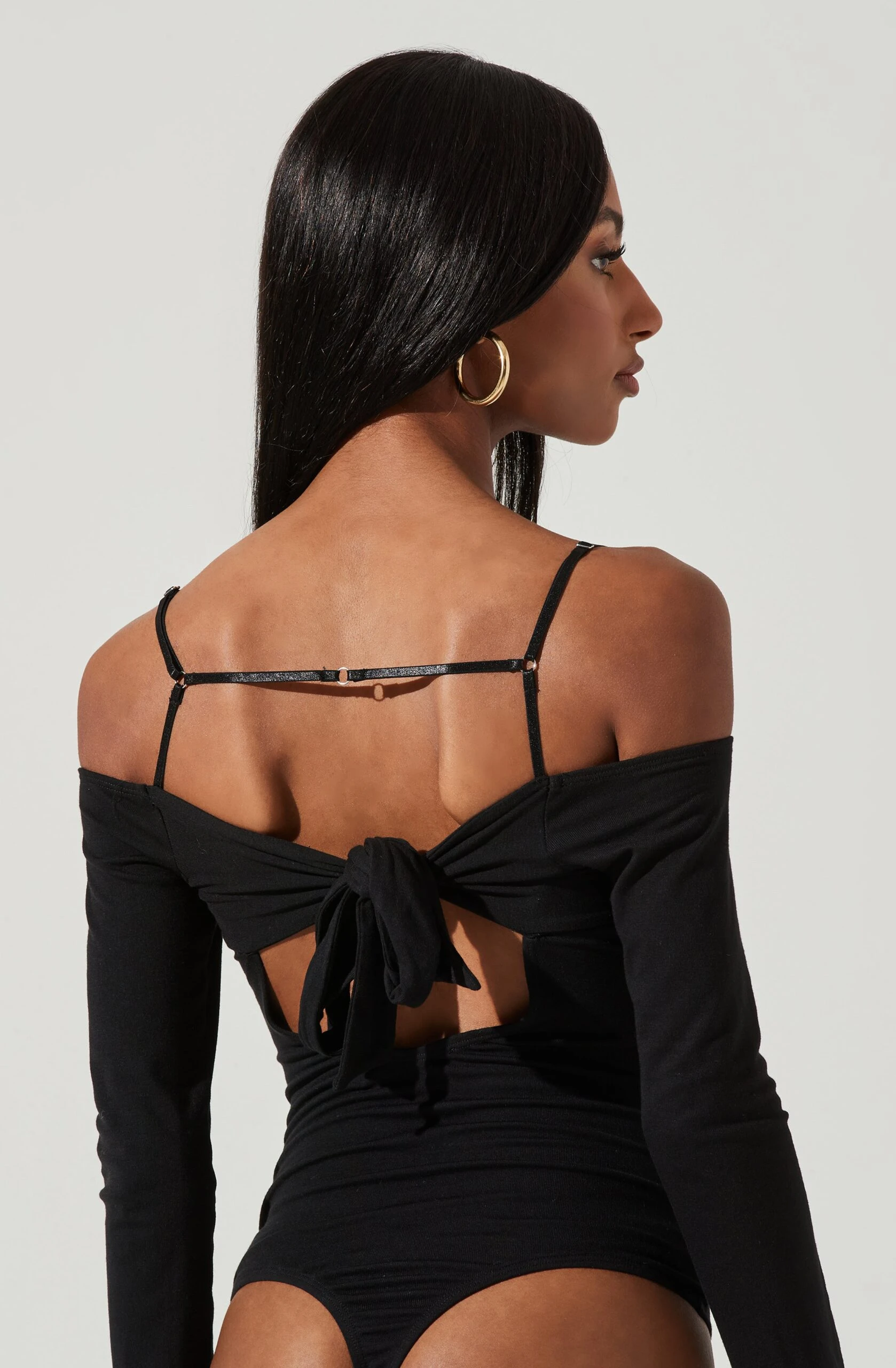 The Alessa Bodysuit offers a touch of romance with a sweetheart neckline and cold shoulder design. Cupped bust leads to a fitted silhouette. Adjustable straps lead to a tie back accent. Long sleeves. Attached thong bottoms have snap button closures.