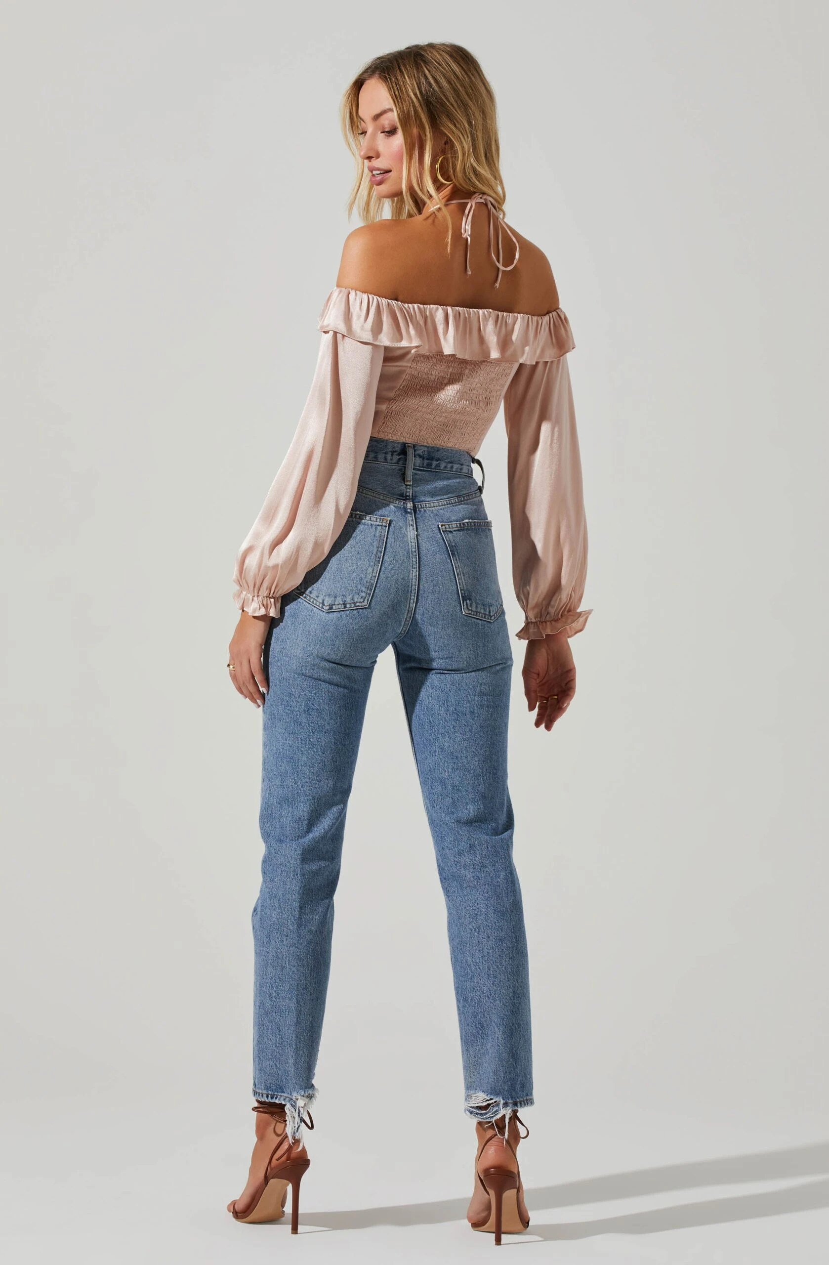 The Allison Top has a chic, satin finish. Halter straps tie at the neck and lead to an off-shoulder neckline. Cupped bust leads to a corset-style, hook-and-eye front. Long sleeves.