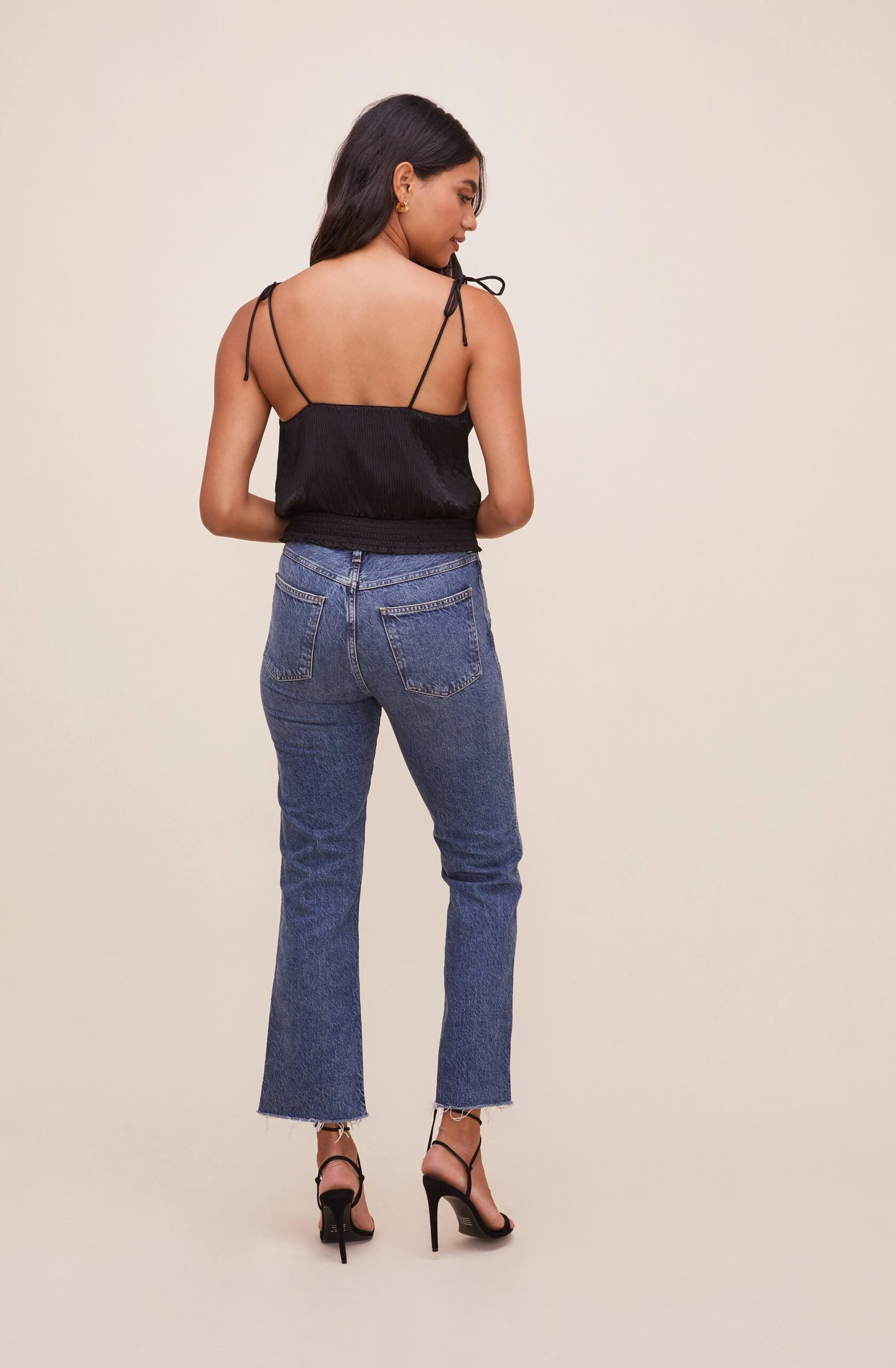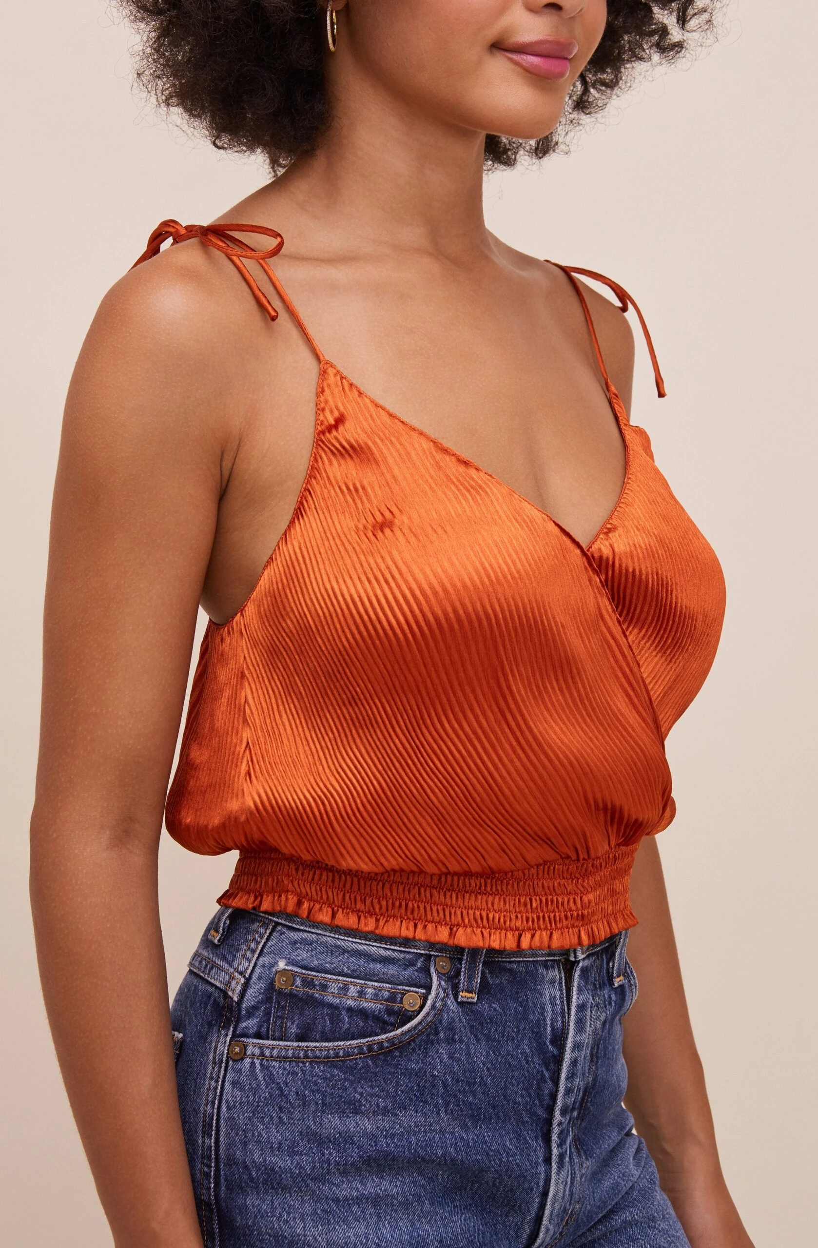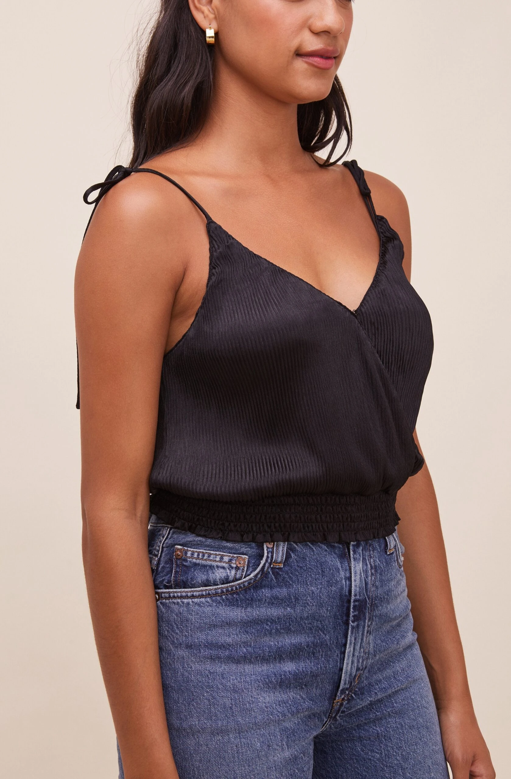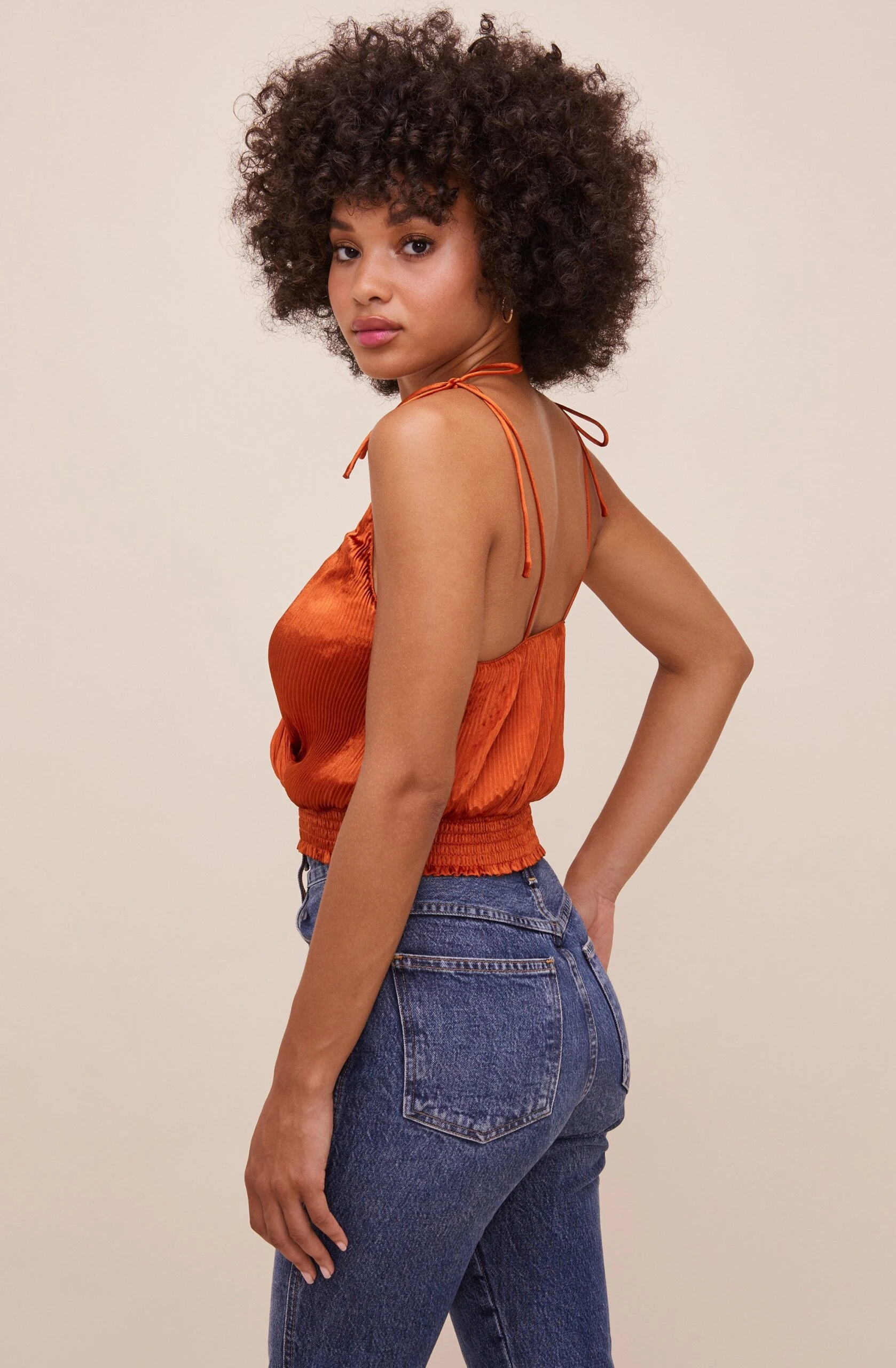 Luxe detailing for fall takes center stage. This dressy crop top features a perfectly pleated fabrication for ultimate outfit interest. Sexy V neckline is supported by delicate self-tie shoulder straps. Wrap front leads to a smocked waist. Low cut back.