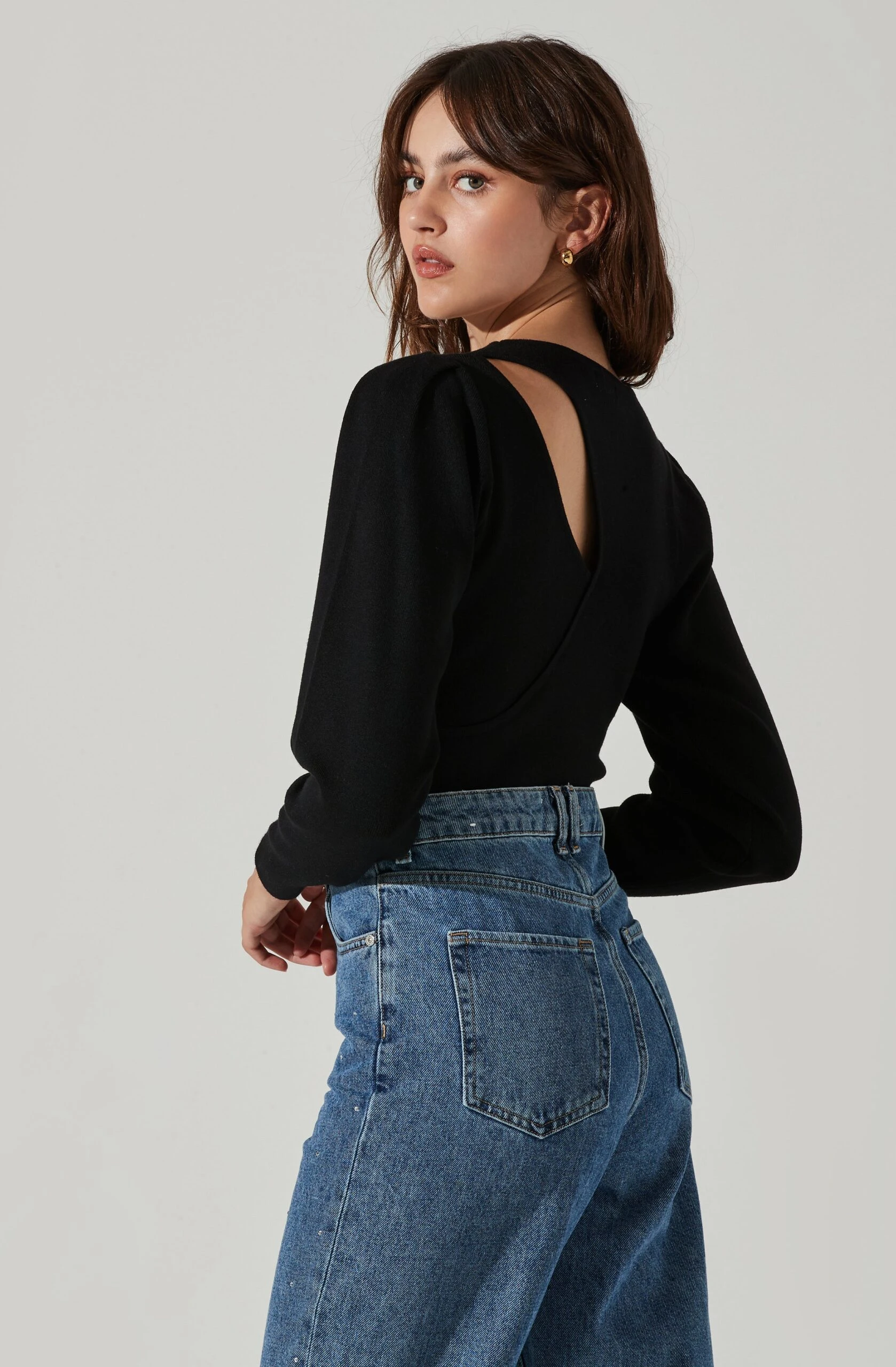 This top features a knit construction. Round collar leads to an asymmetrical cutout at the neck. Long sleeves.