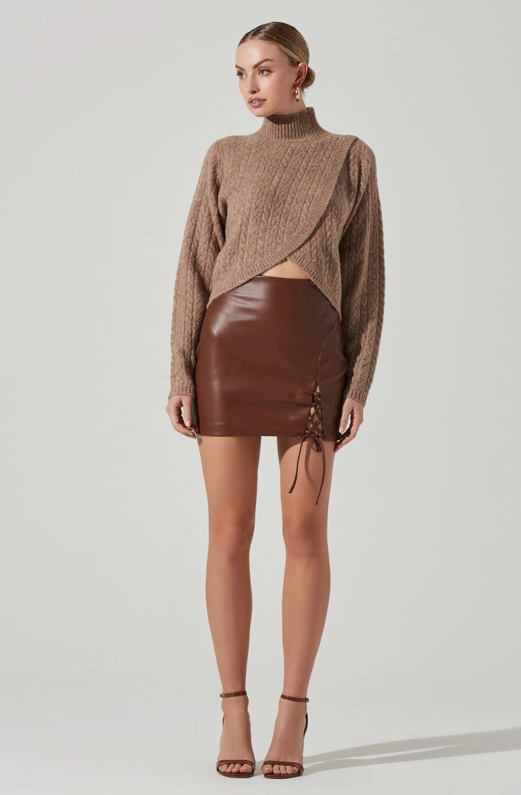 The Atwell Skirt features a faux leather construction. High waist leads to a lace up split hem detail.
