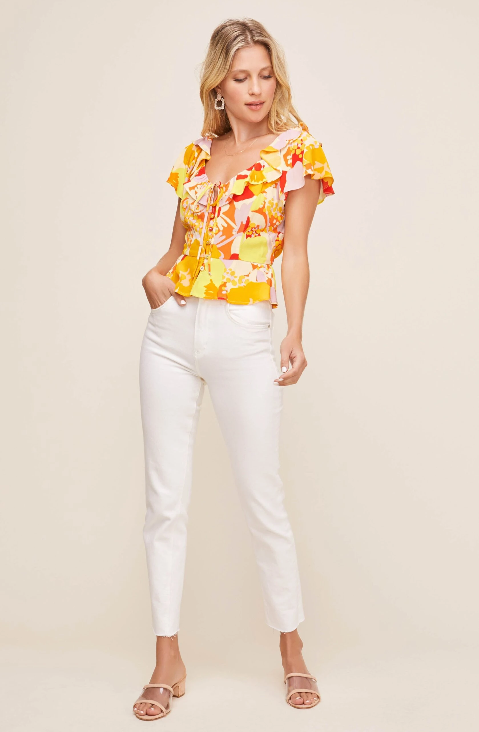 Let’s get tropical this summer! The Belize Top features a scoop neckline with a ruffle trim and short flutter sleeves. Front tie accent leads to a button down bodice with a slight flare. Bright and cheerful tropical print throughout.