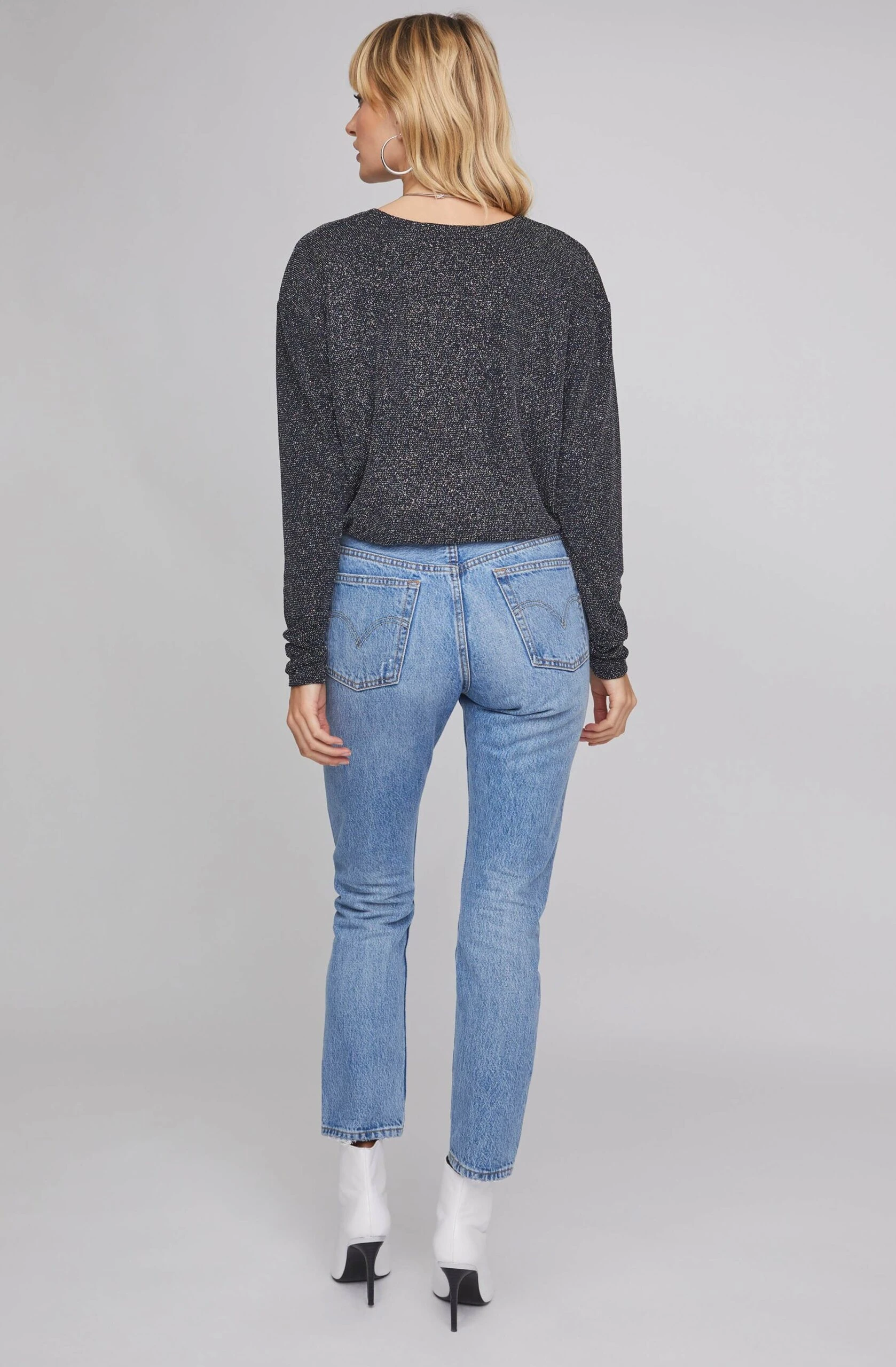 Metallics on your mind? Reach for a perfectly draped top that features a plunging neckline, wrap bodice and long sleeves. Stretch-knit with a metallic finish.