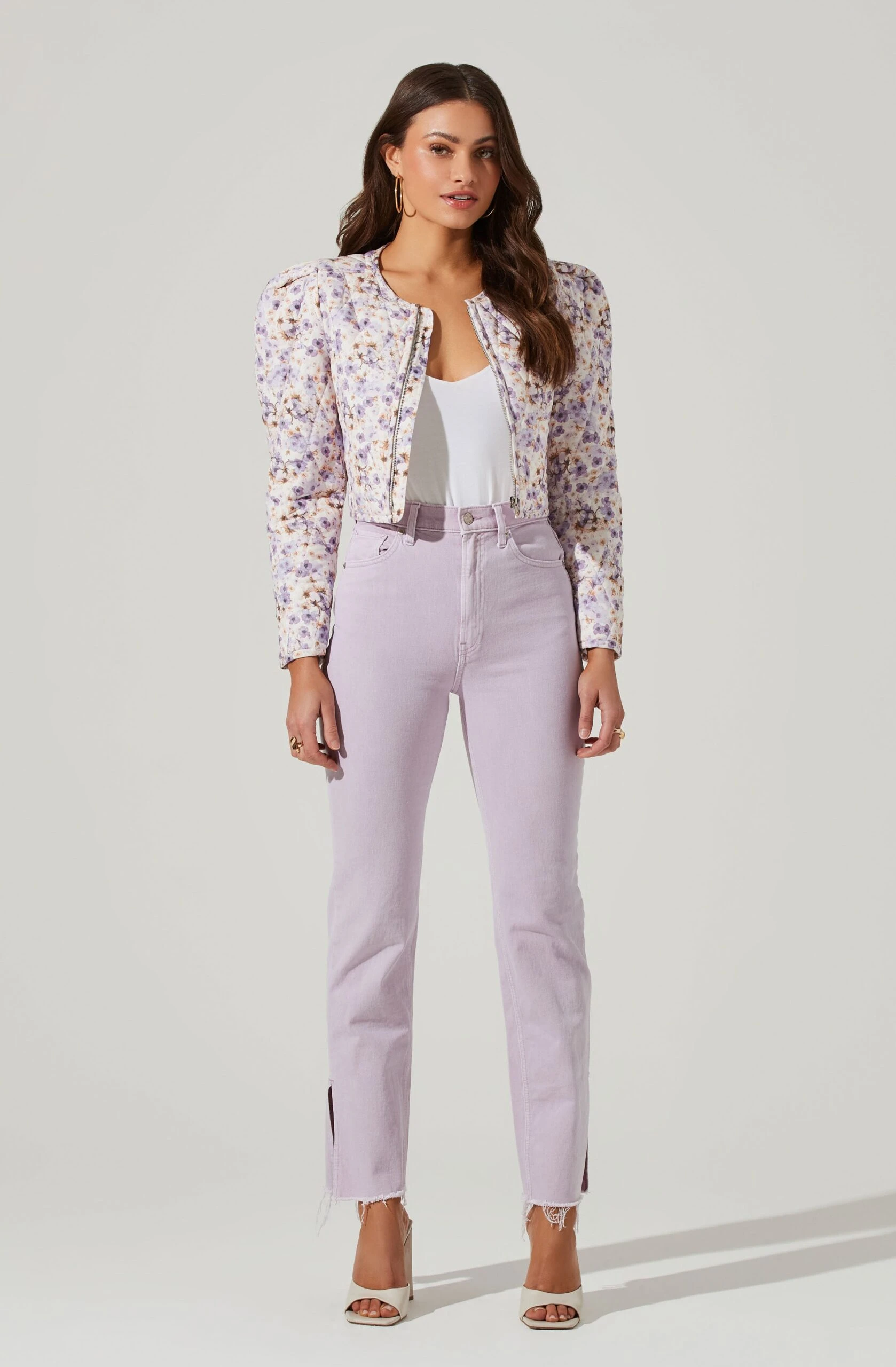 The Brea Jacket features a statement floral print that brightens up your wardrobe. Quilted finish adds a new texture. Collarless neckline leads to a front button placket. Long sleeves with exaggerated shoulders.
