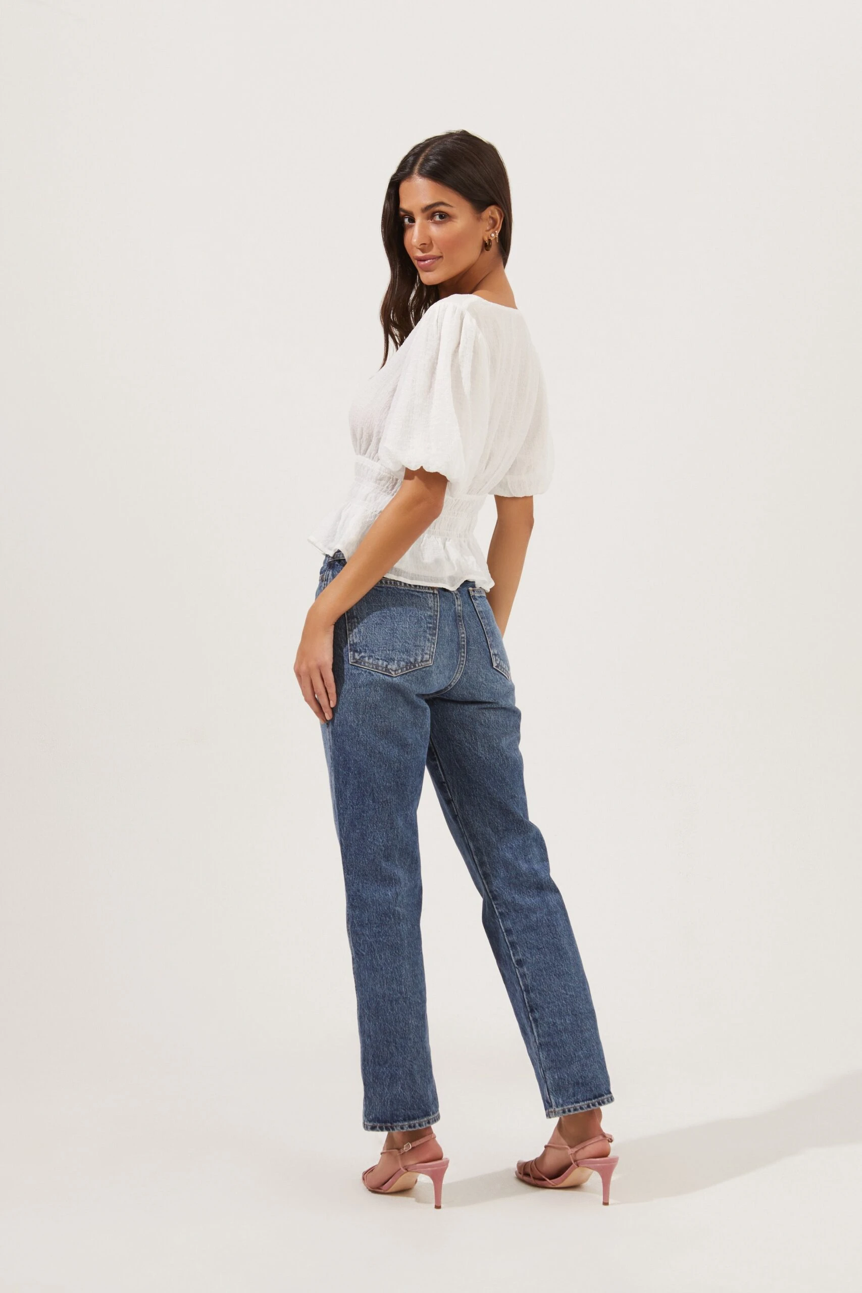 Make it special with a statement top. It features a V neckline that leads to a wrapped front and smocked waist. Short, bubble sleeves for an elevated silhouette. Peplum hem.