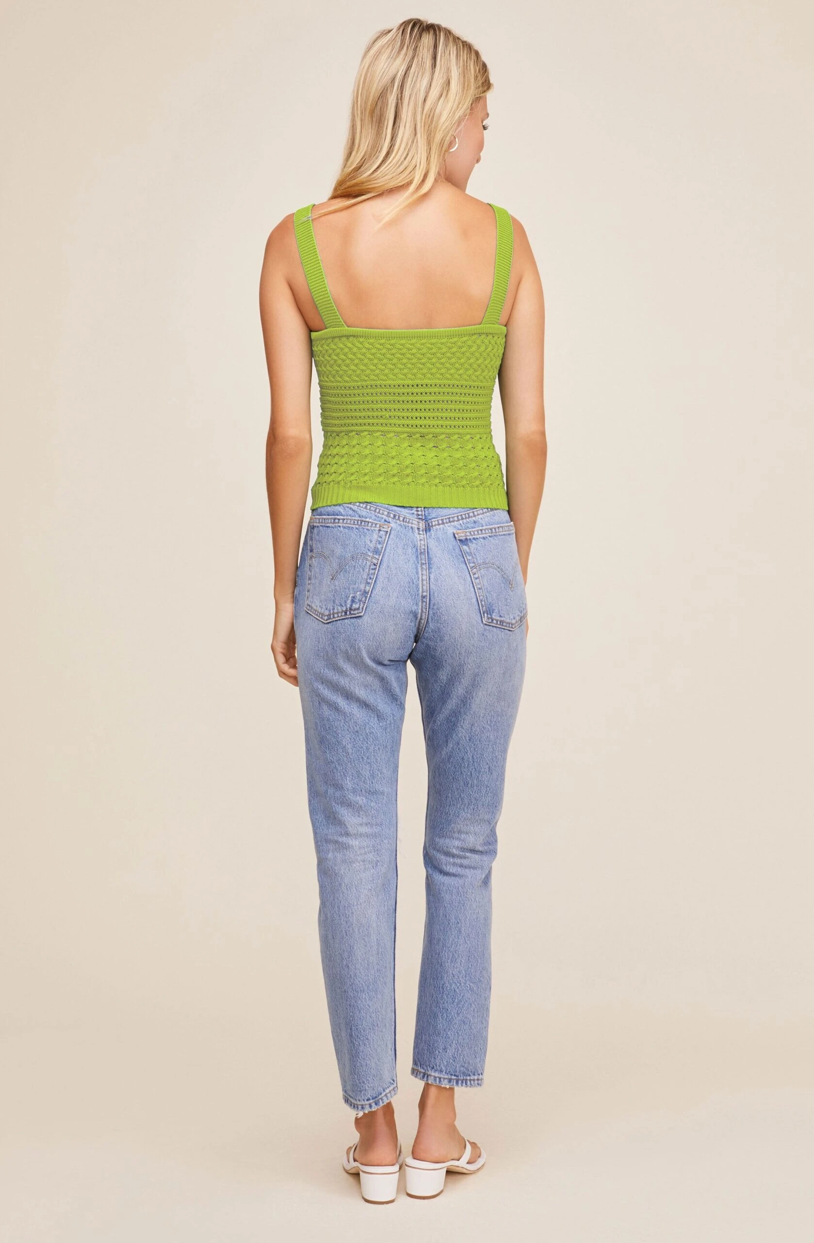 Find your summer style in the Darci Top! This chic piece features a square neckline, textured crochet style design and statement straps.