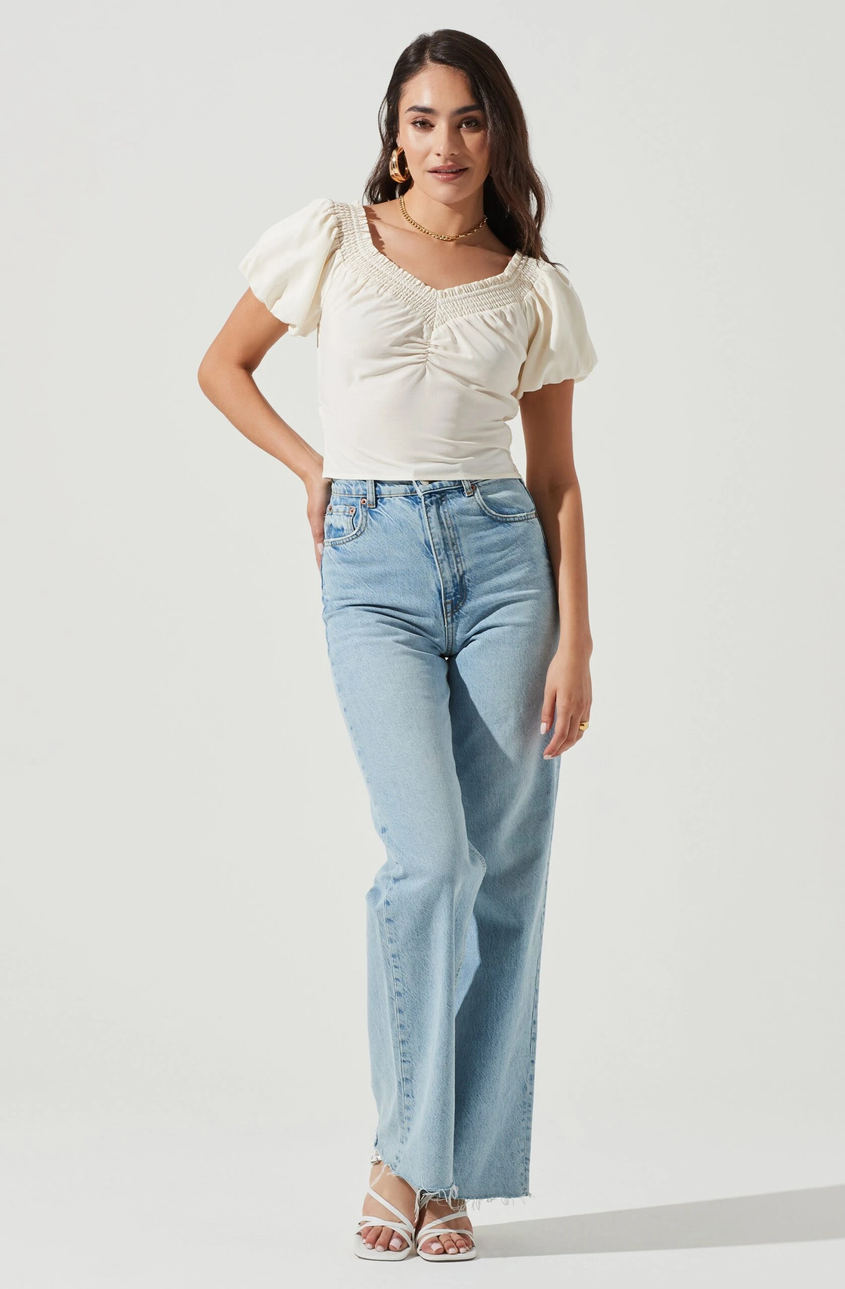 The Delano Top features a smocked off-shoulder neckline that leads to a ruched bust. Short puff sleeves. Smocked waist.