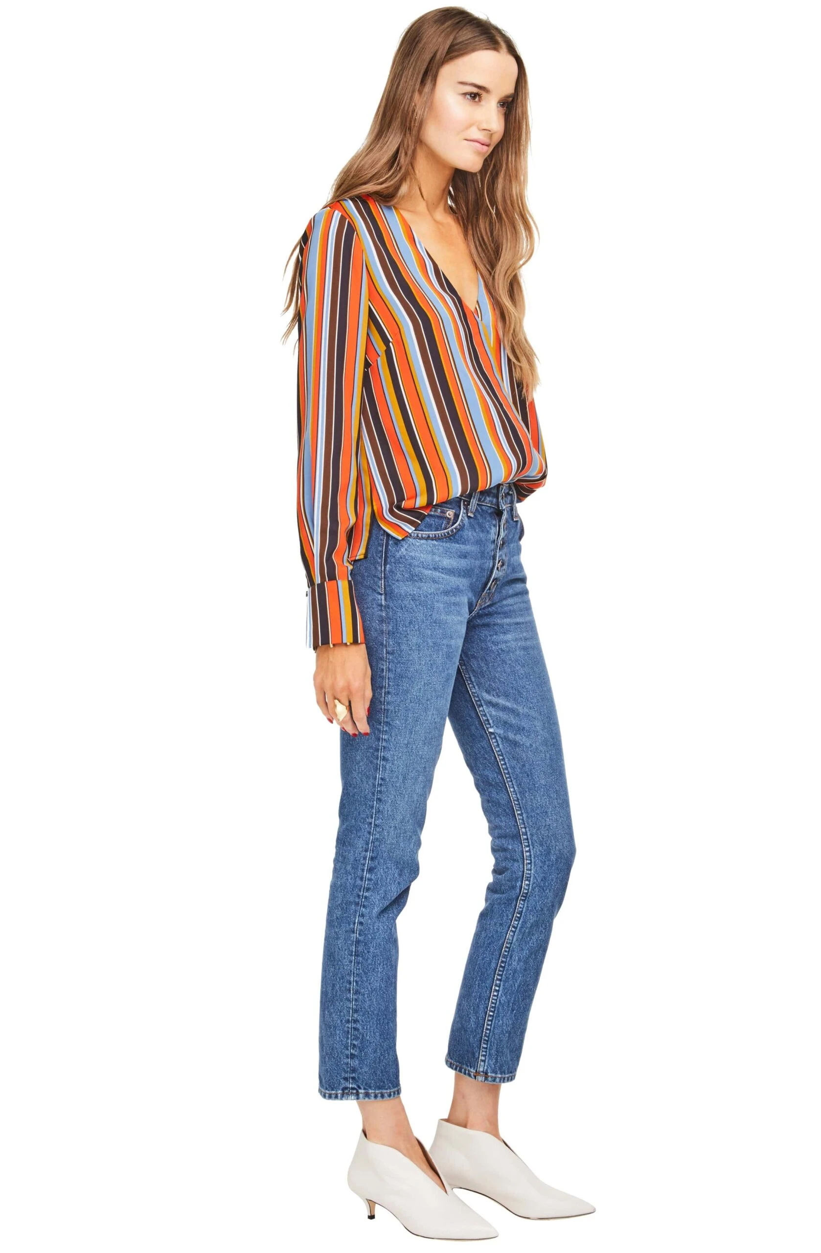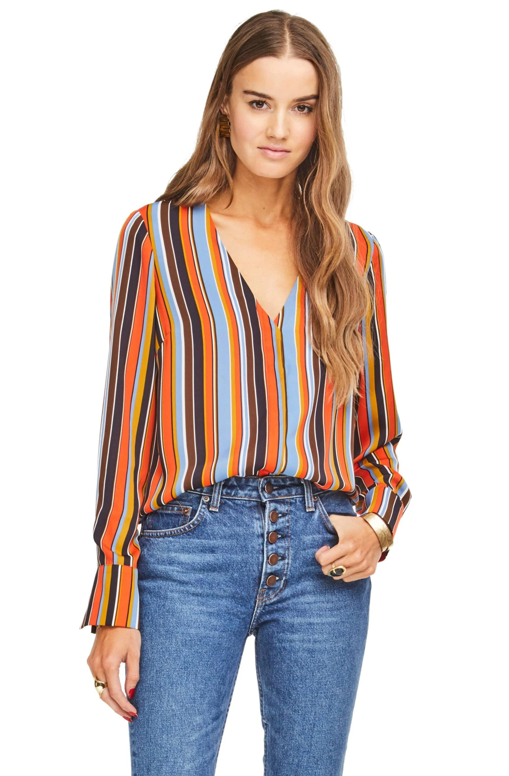 100% Polyester, Length: 23 5/8″ (Size M), Button Closure, Dry Clean Only, Surplice Neckline, Striped Long Sleeved Blouse, Model is Wearing Size S, Model’s Measurements: Height 5’10” // Bust 34″ // Waist 24″ // Hips 34″, Fits True to Size, Style#ACT15018