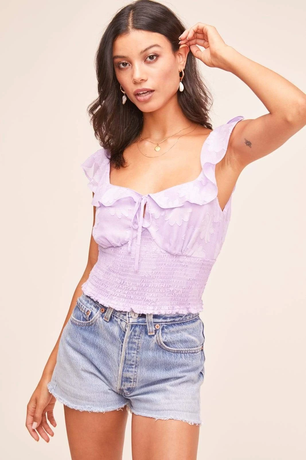Short and sweet, this crop top makes summer styling easy. Square neckline is accentuated with a ruffle trim and leads to a tie front accent. Delicate floral applique embellishment throughout and smocked waist adds a perfect feminine touch.