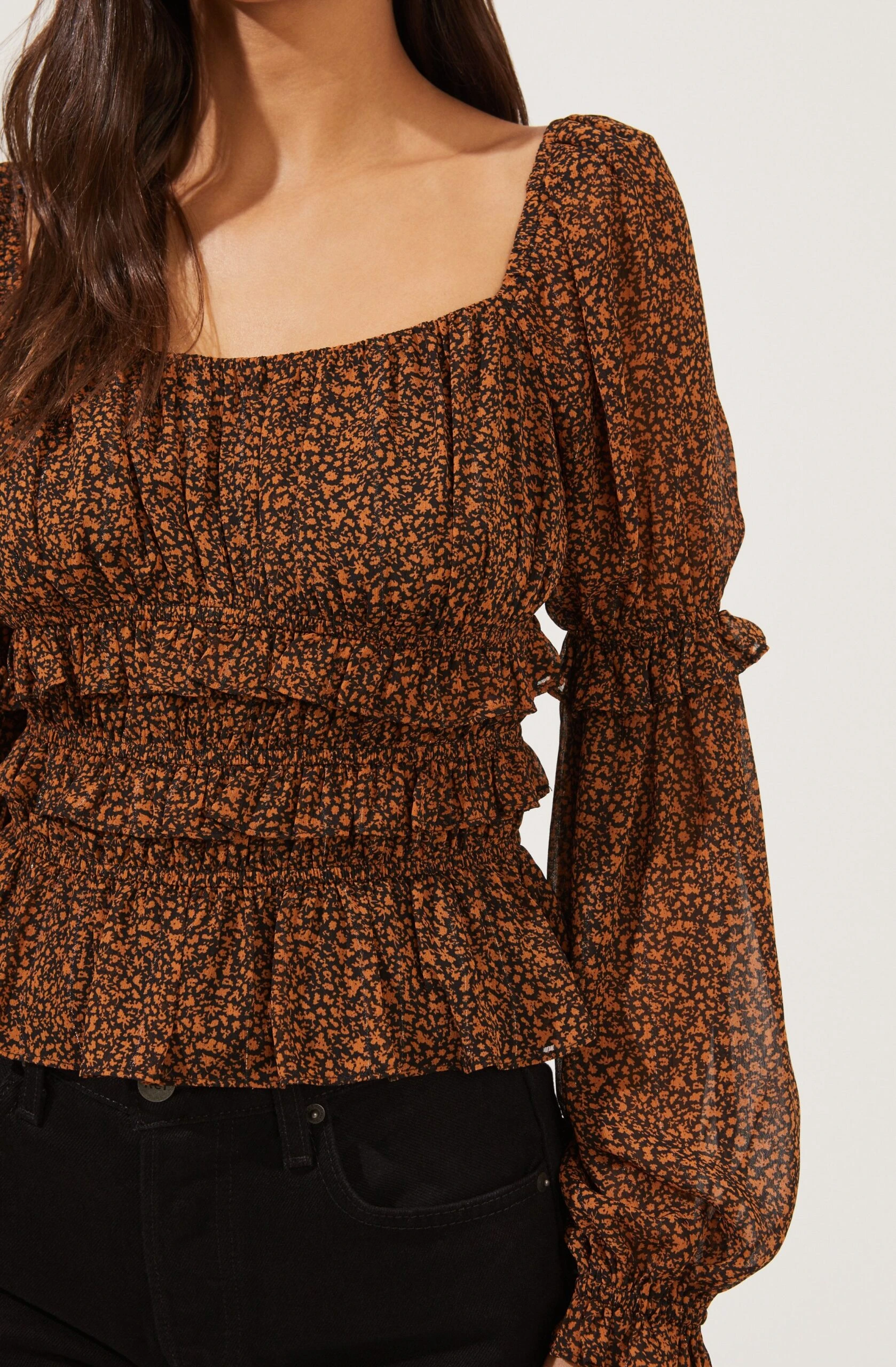 Elevate your aesthetic with the Fairfield Top. It features a square neckline that descends to a tiered ruffle trimmed bodice with soft smocking throughout. Gold metallic thread woven throughout the floral print fabric. Long sleeves. Elastic cuffs. Tie back accent.