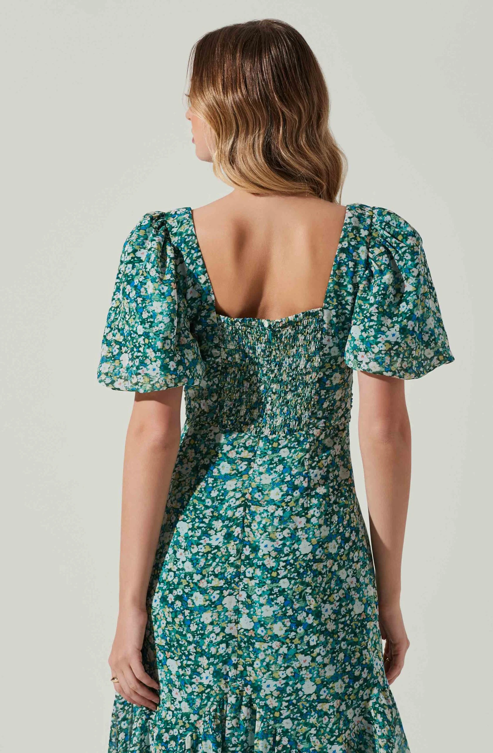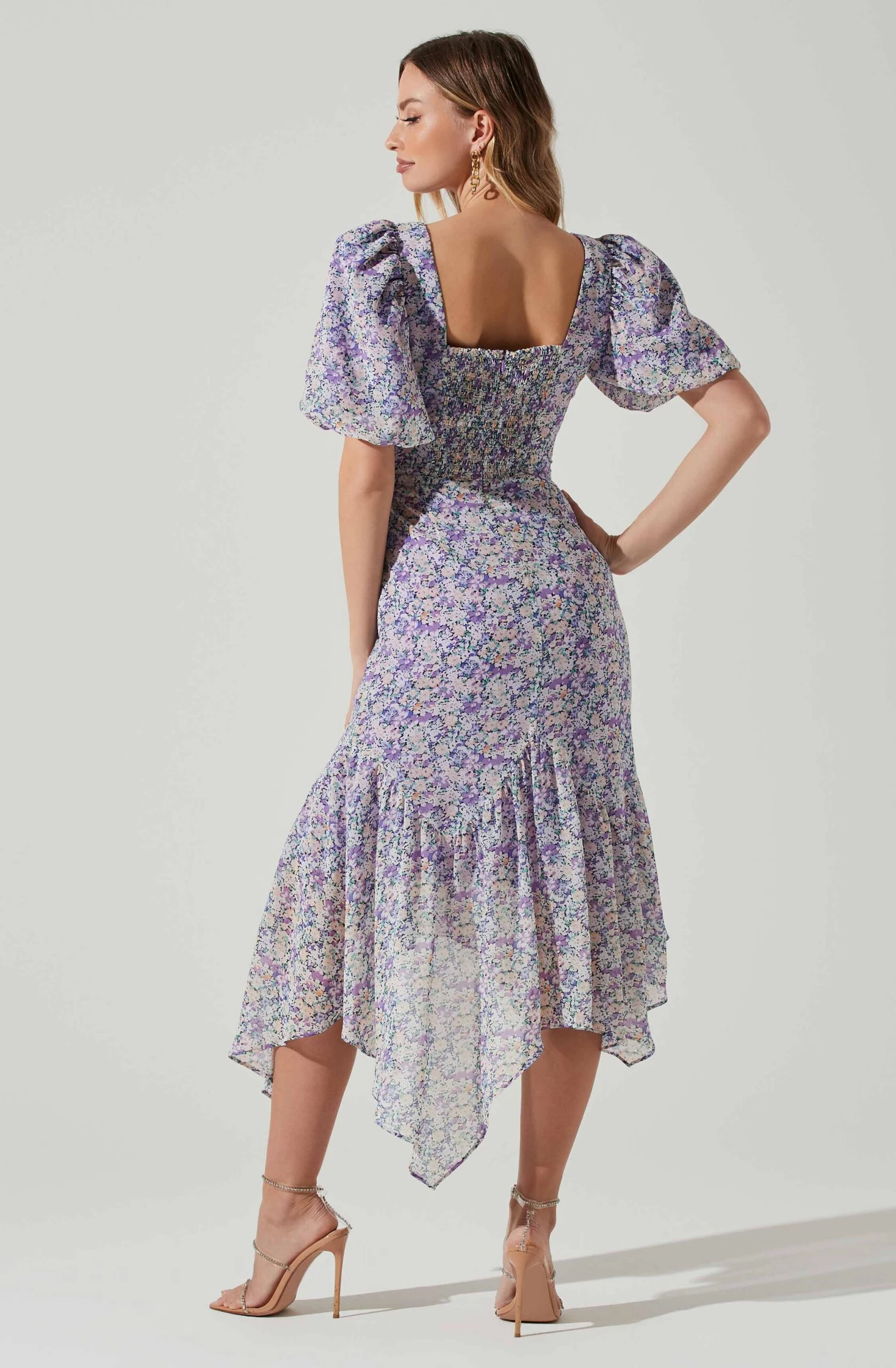 This elegant floral dress features a sweetheart neckline that leads to a ruched bodice and asymmetrical hemline. Short balloon sleeves. Smocked back. Lined.