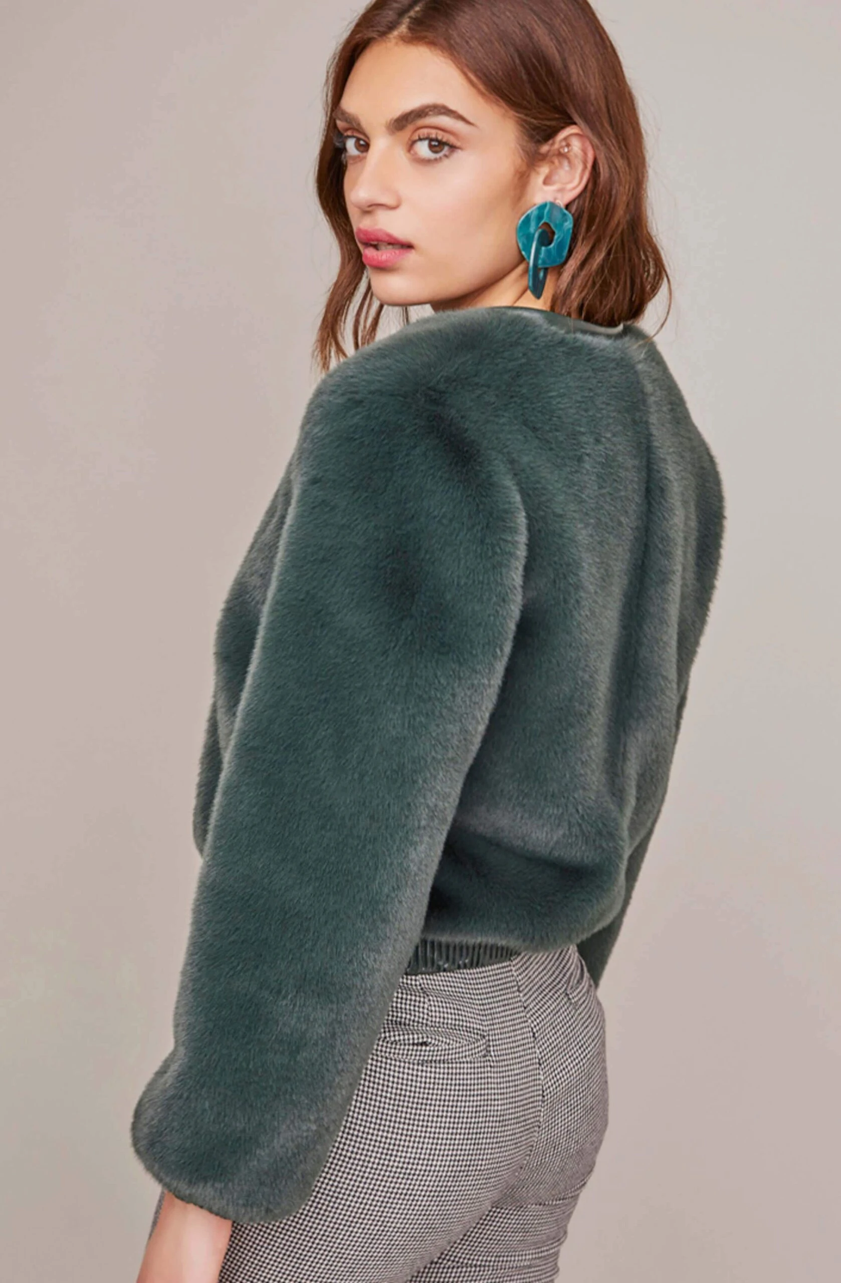 Brave the cool days ahead in faux fur. This luxe jacket features a ribbed collar and cuffs along with slanted hip pocket accents. Long sleeves.