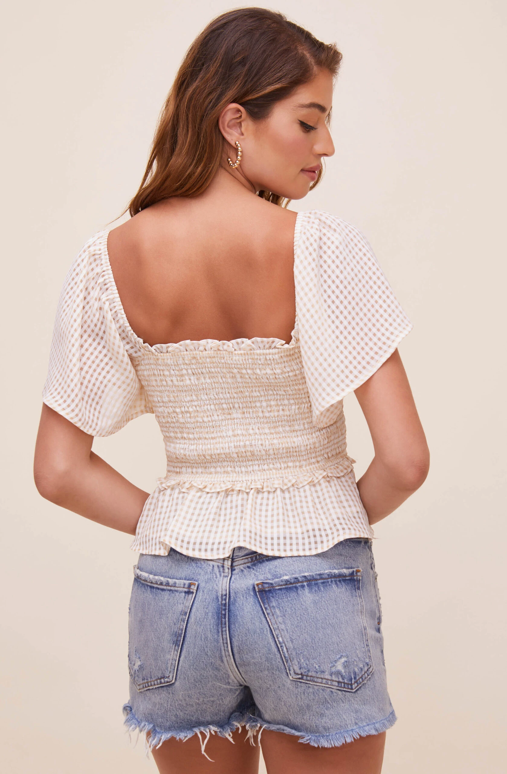 The January Top features a square neckline that leads to a smocked front and descends to a peplum hem. Short flutter sleeves.