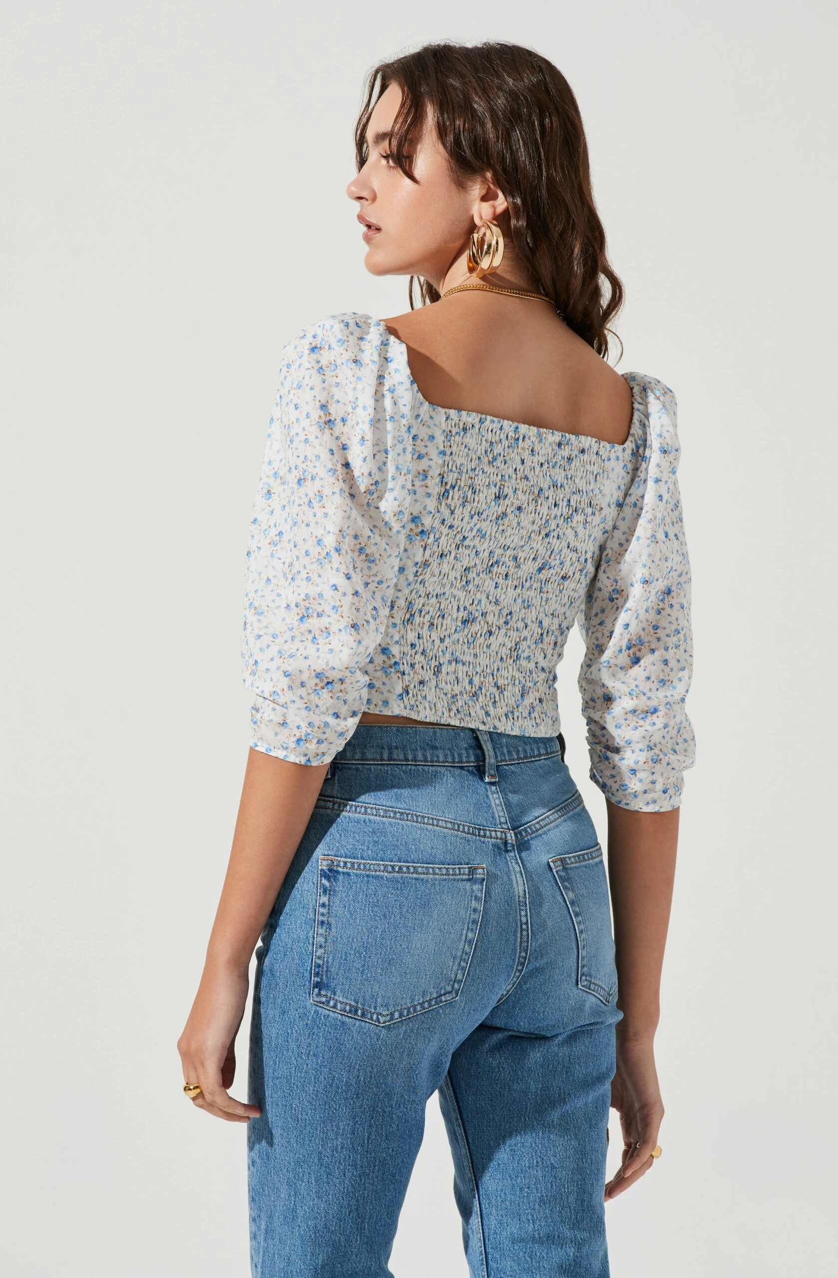 The Kemp Top features a soft floral print with a square neckline that leads to a cropped hemline and three-quarter puff sleeves. Smocked back.