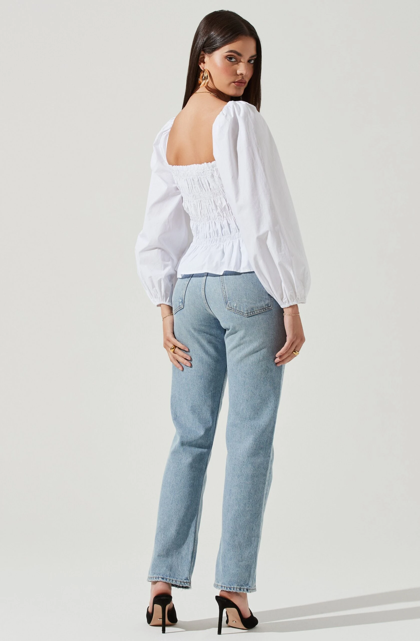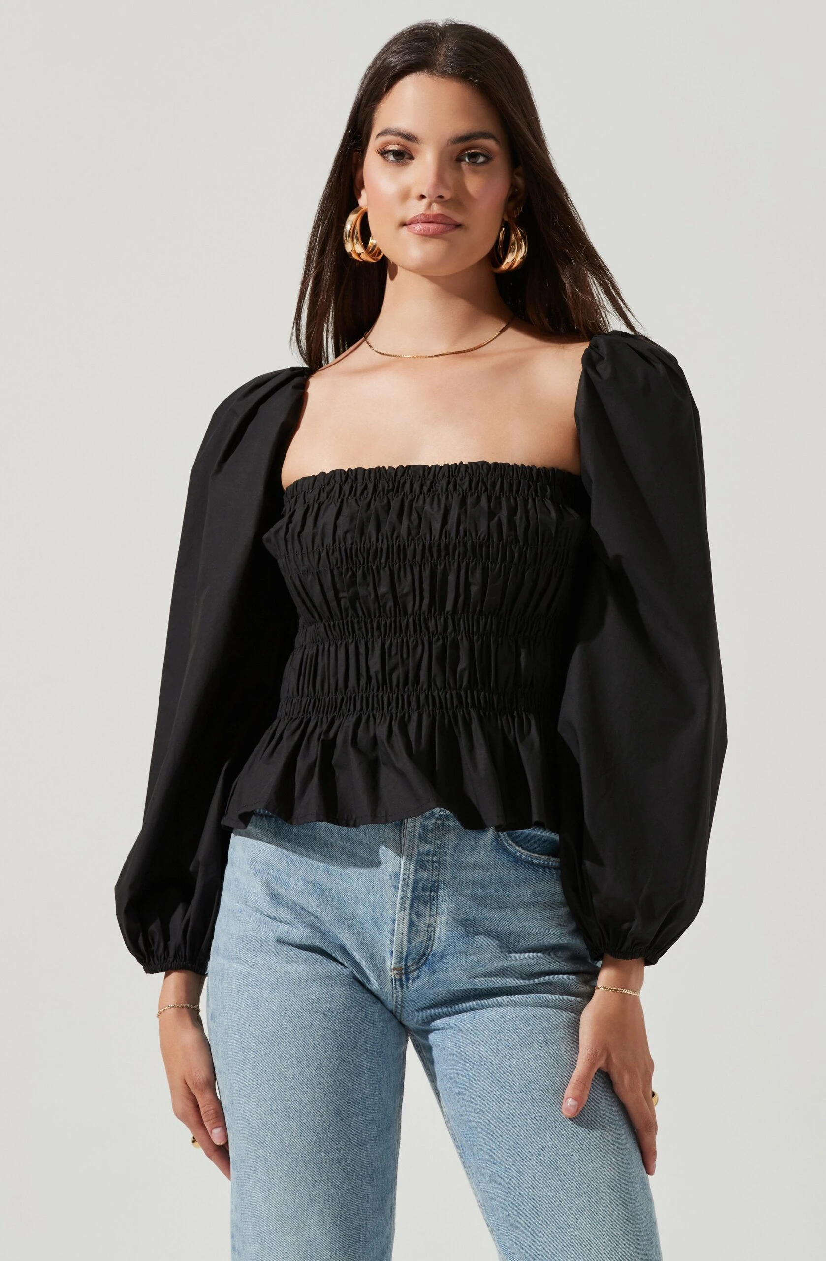This dreamy top features a square neckline that leads to a smocked design and subtle peplum hem. Long puff sleeves with elasticized cuffs.