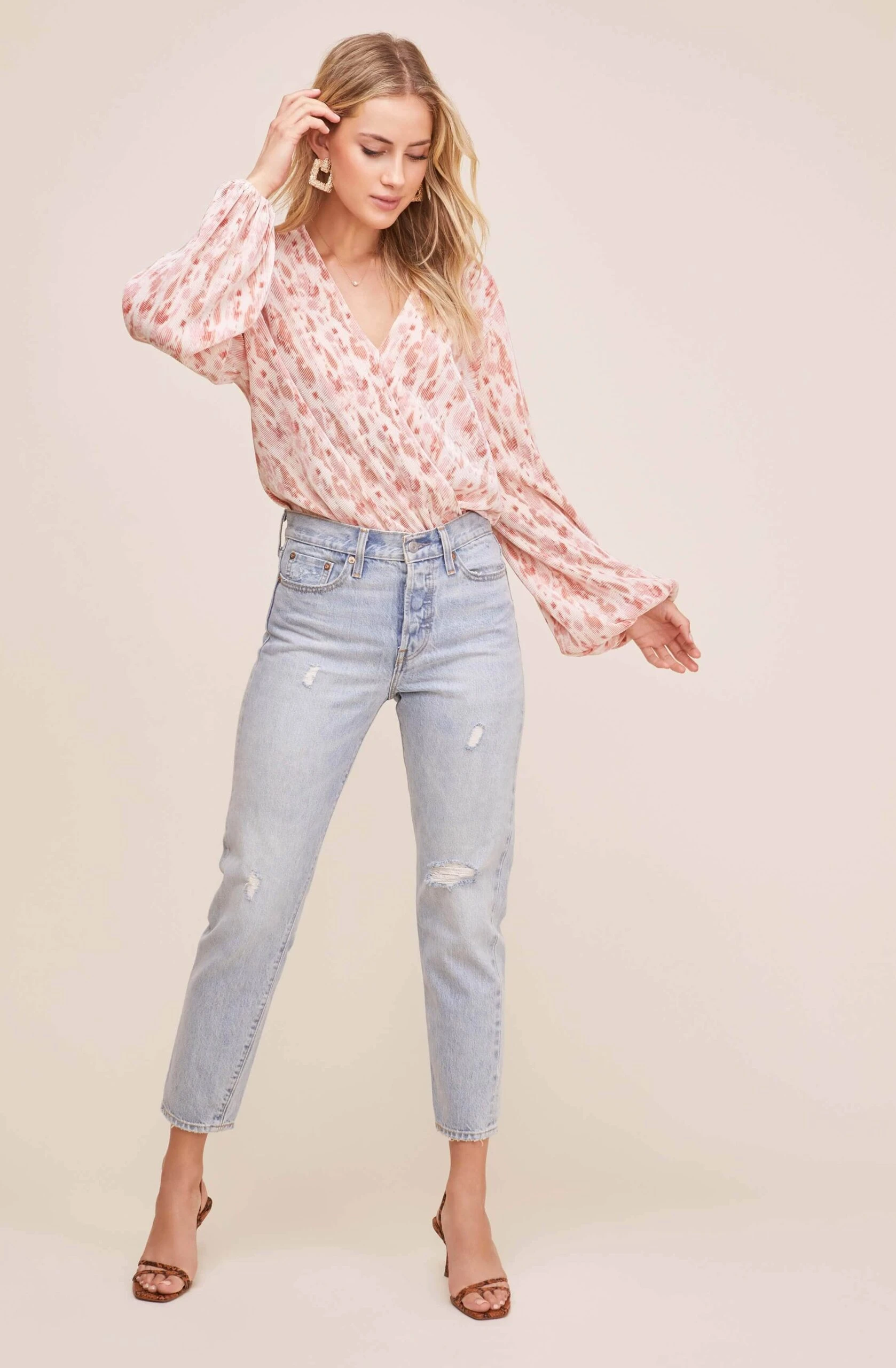 When in doubt, just add a bodysuit. This style features an elevated plisse design along with a modern tie dye print throughout. V neckline meets a wrap front for sophisticated and fun styling. Long puff sleeves.