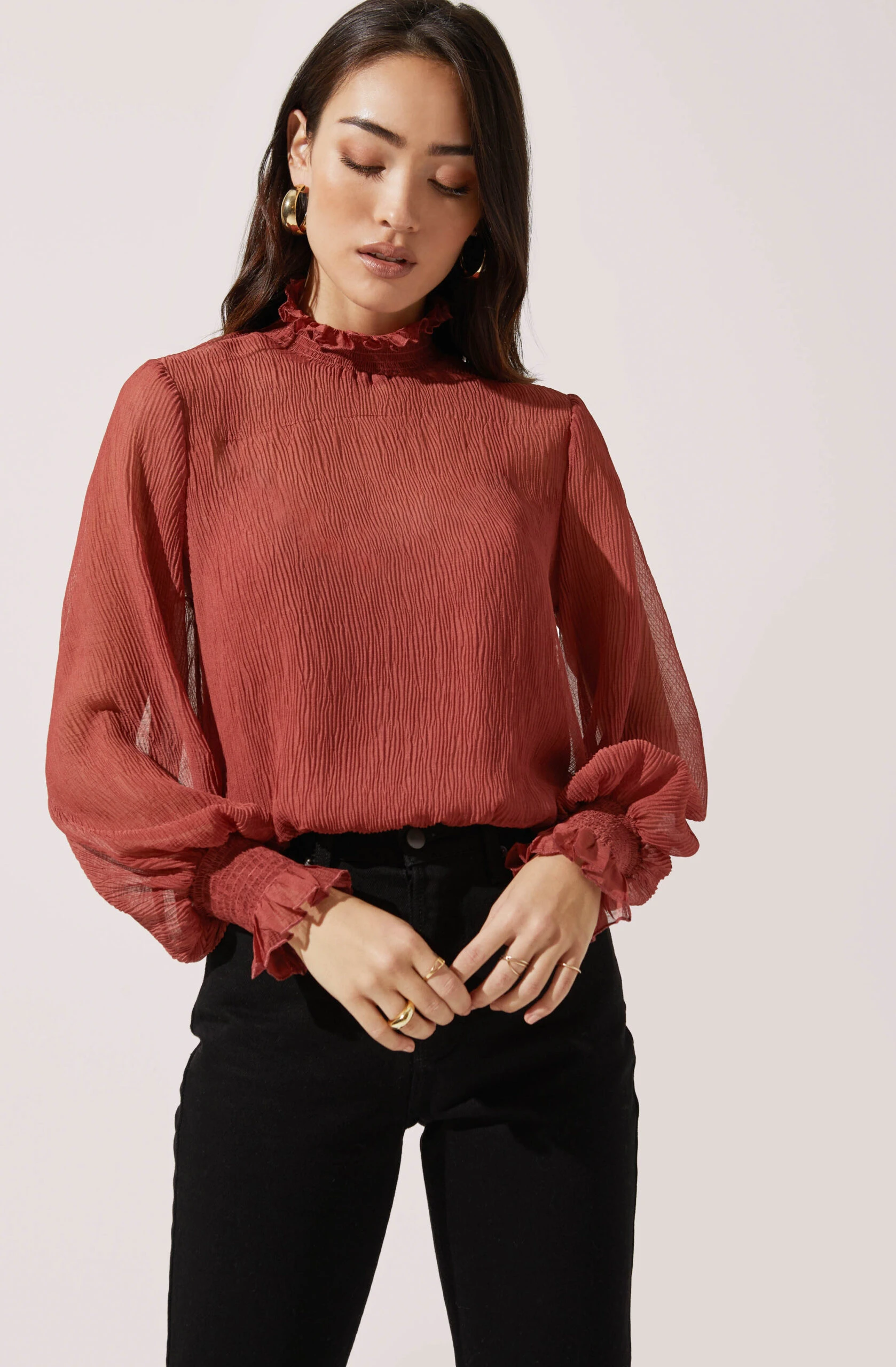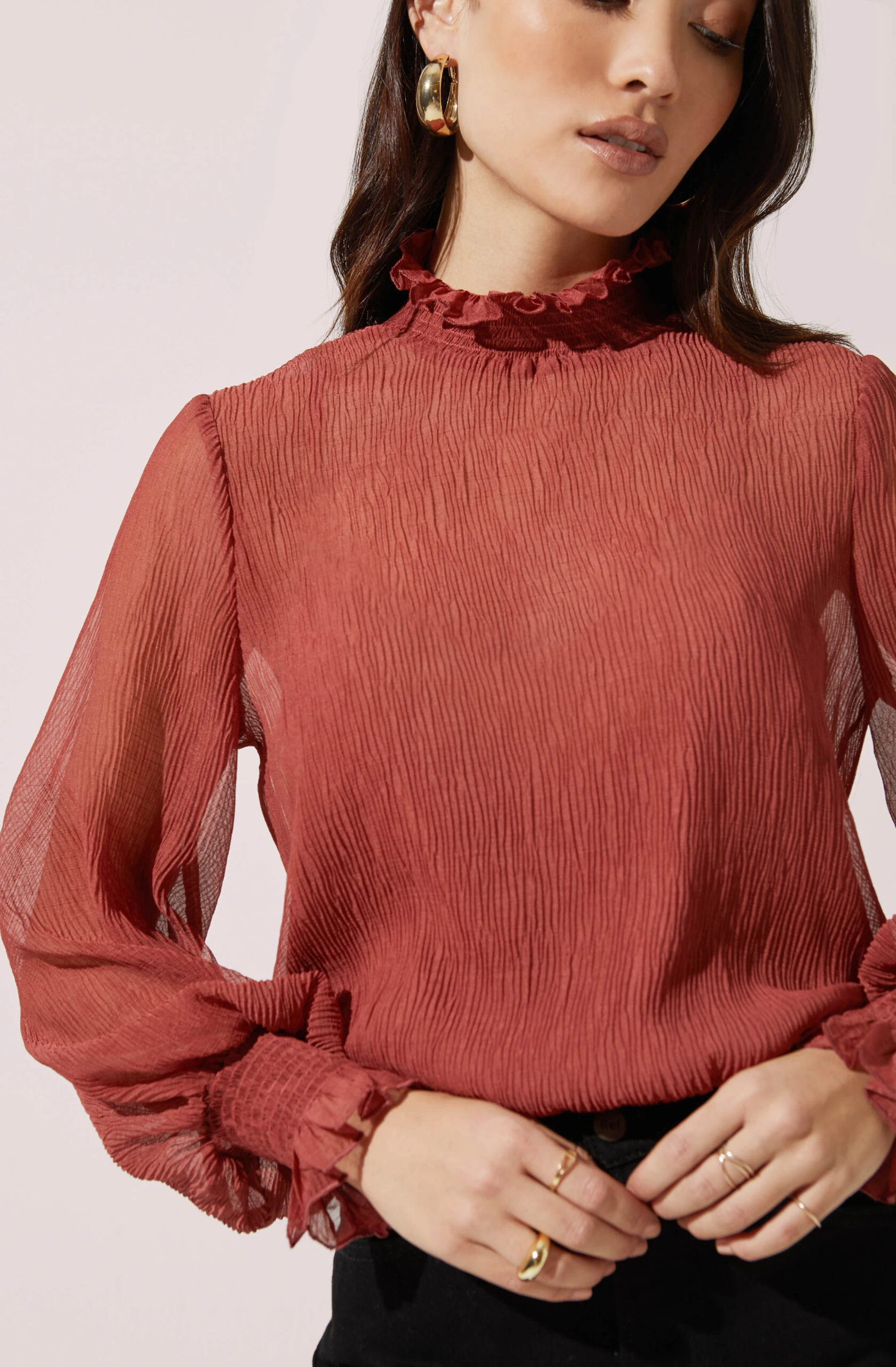 This elegant top features a ruffle mock neck collar that leads to a semi sheer front with a pleated design. Long blouson sleeves with smocked cuffs.