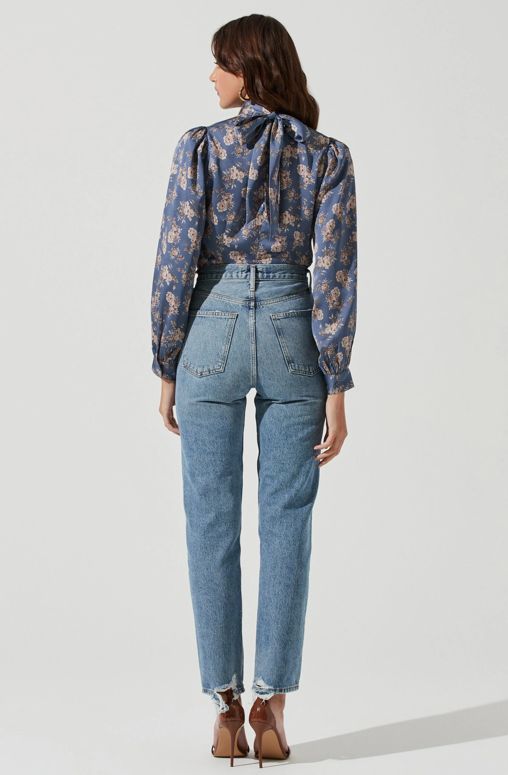 This vintage-inspired style features a mock neck collar with self-tie accents. Darted bust leads to a fitted bodice. Long balloon sleeves.