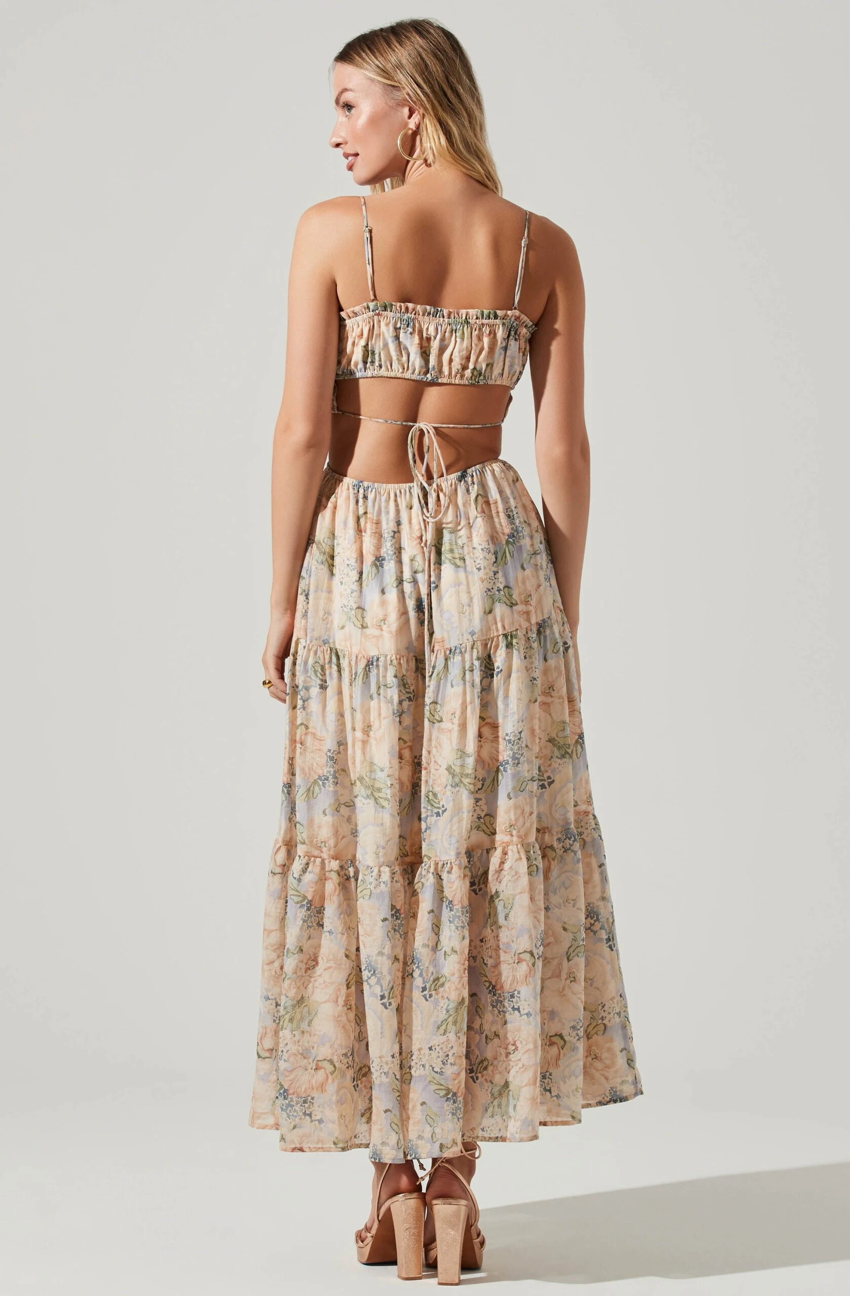 The Odina Dress features a floral print throughout. Square neckline leads to a smocked bodice and cutout detail at the bust and sides. Tiered midi skirt. Tie back strap. Adjustable straps.