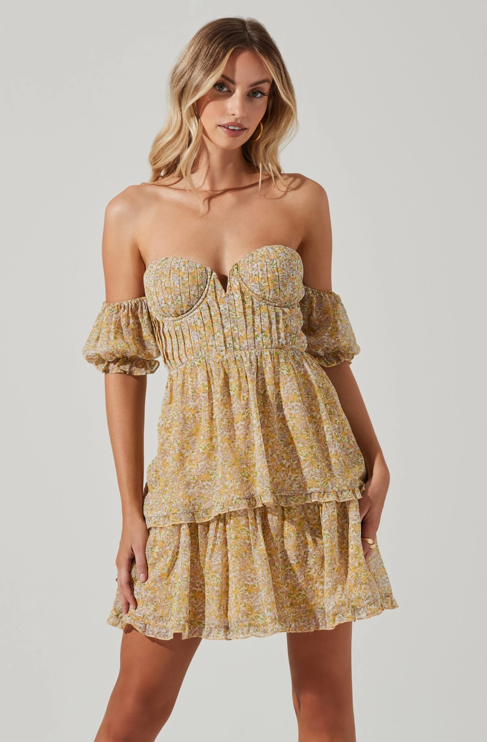 Take your occasion look to new levels. This mini dress features an off-shoulder design with a sweetheart neckline and cupped bodice with statement pleats. Short puff sleeves. Two tiered mini skirt. Smocked back. Fully lined.