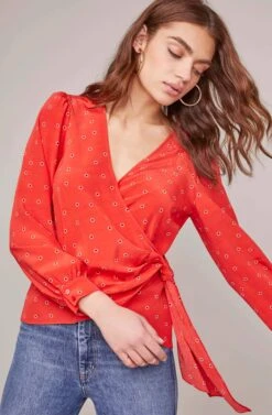 With a classic yet modern touch, this top pairs perfectly with your favorite pair of jeans! This effortless style features a V neckline that descends to a wrap front and side tie accent. Long cuffed sleeves. Statement dot print throughout.