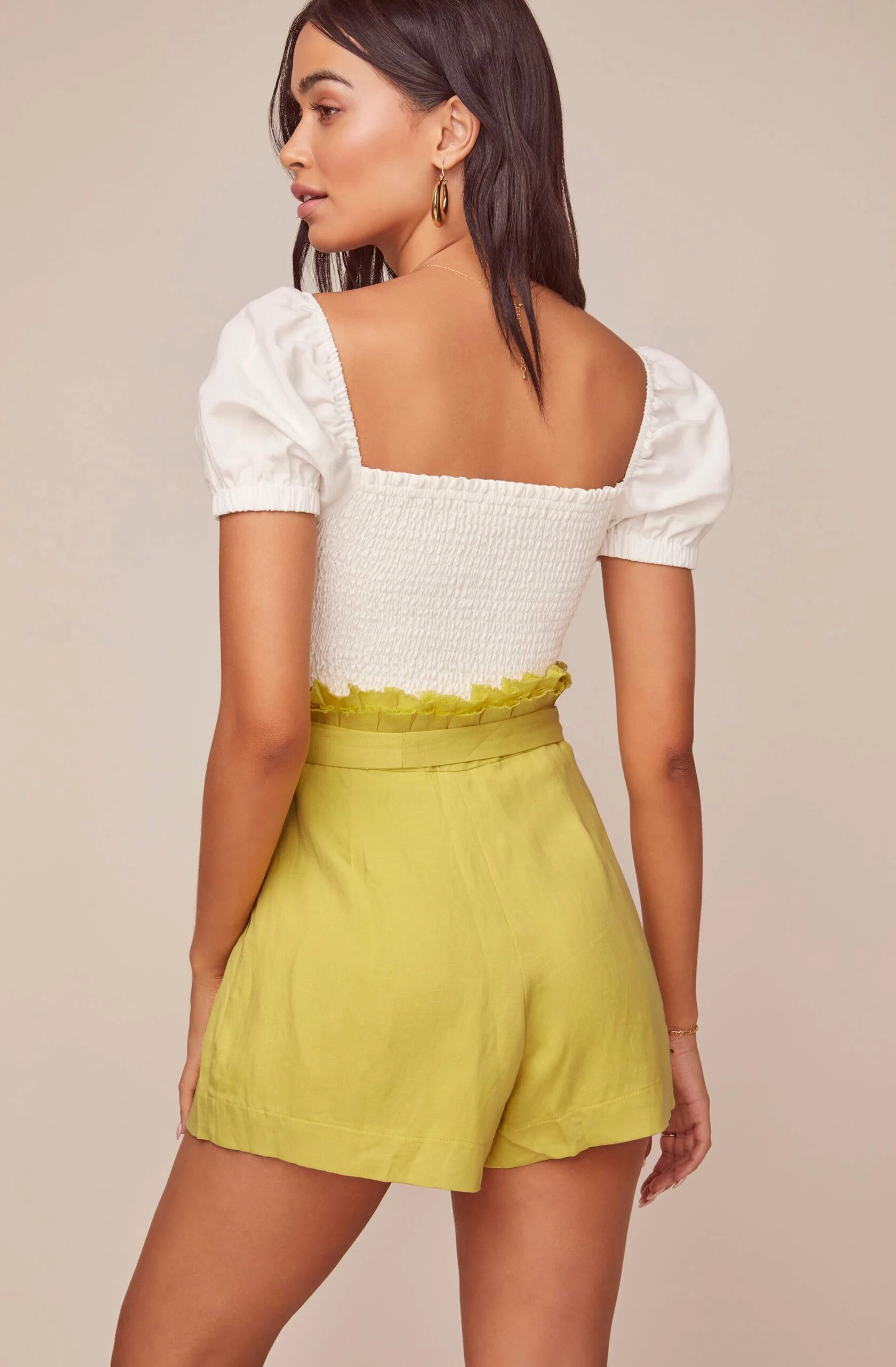 Leg-baring styles make spring fun! The Pacific Shorts feature a paperbag waist complete with a self-tie belt that descends down to a pleated front and slanted hip pockets.