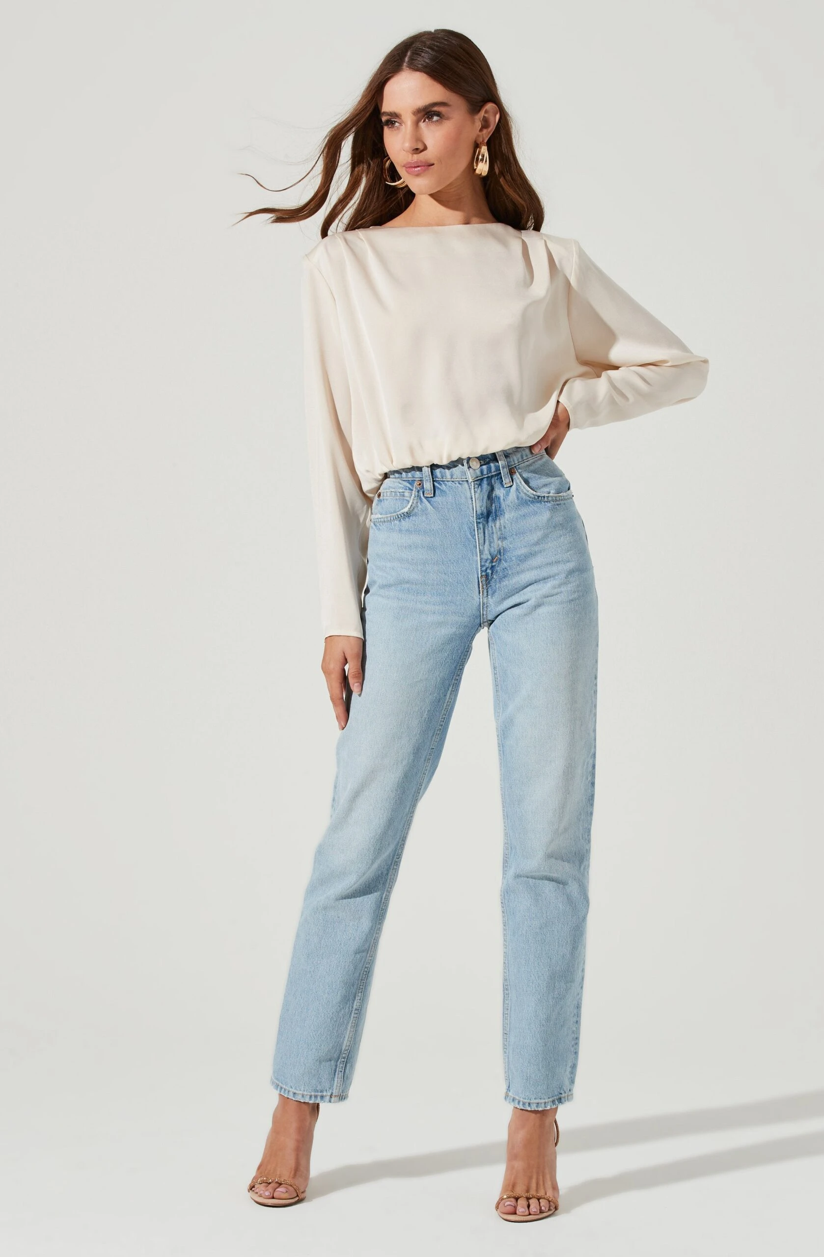 Take this satin look to the next level. It features a pleated shoulder design with a slightly oversized fit and long sleeves. Keyhole back.