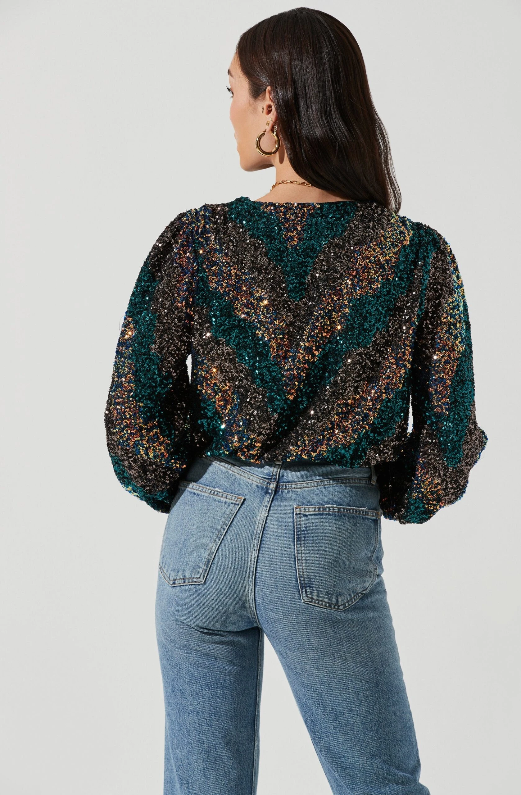 A sequin sunset dazzles your wardrobe. The Primadonna Top features a classic V neckline that leads to a wrapped front and cropped hem. Long statement sleeves and an abstract sequin design throughout.