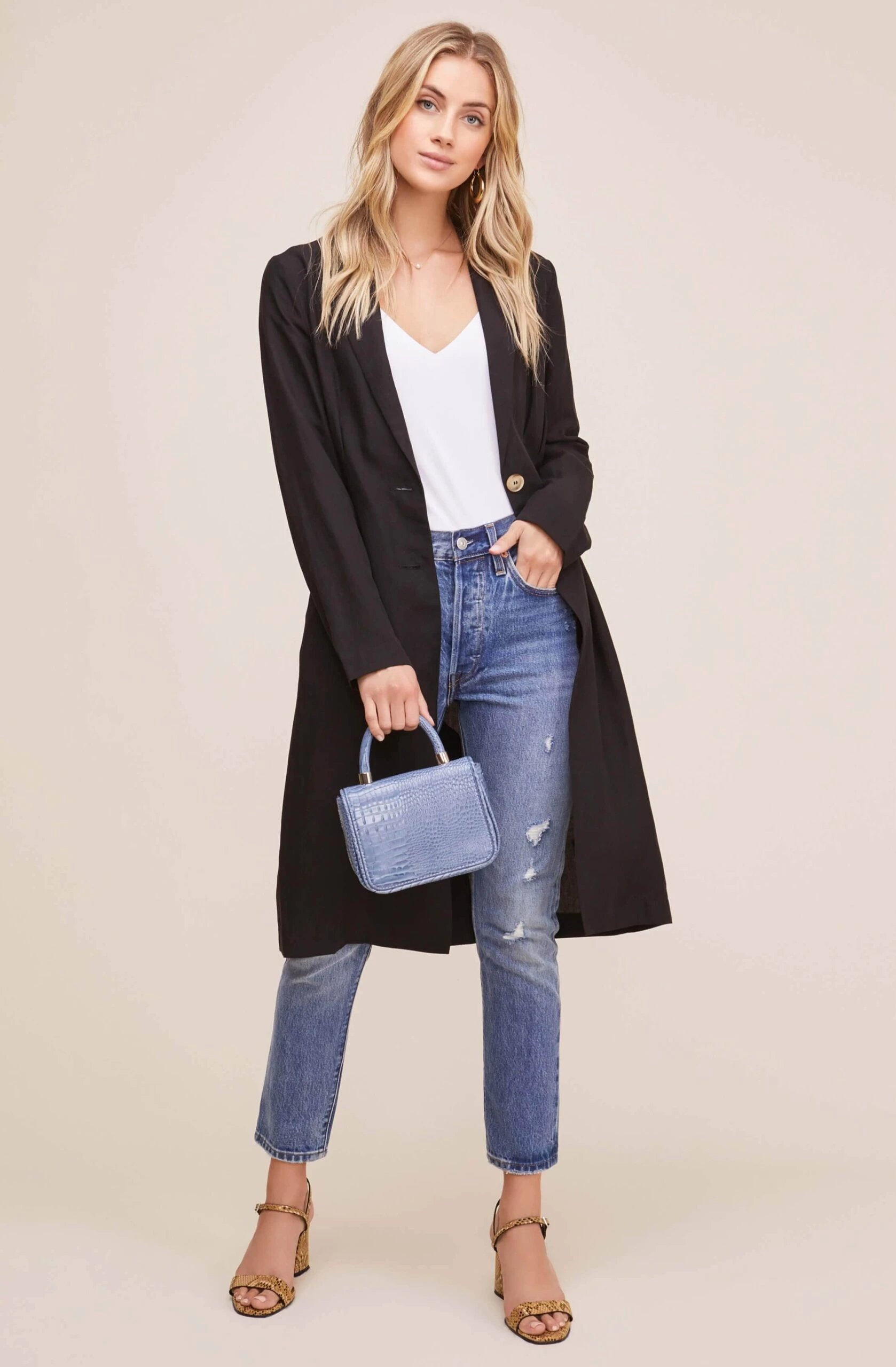 Start your fall jacket collection with style! This timeless coat features a notched lapel, buttoned front and longline silhouette. Vented back. Long sleeves. Side pockets.
