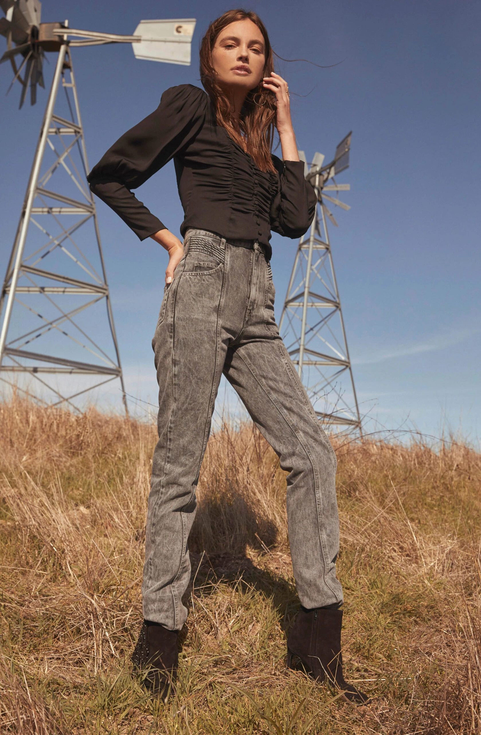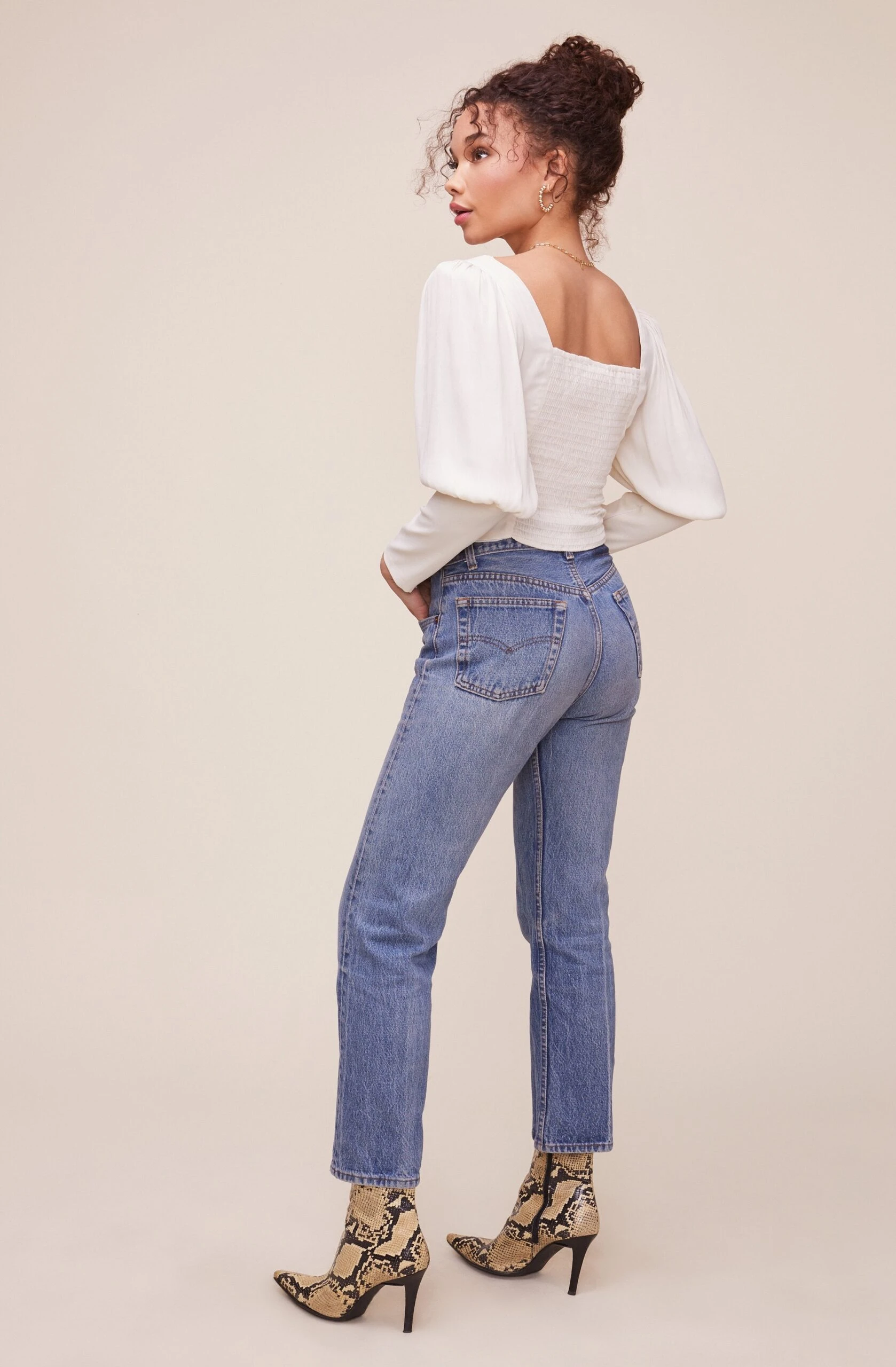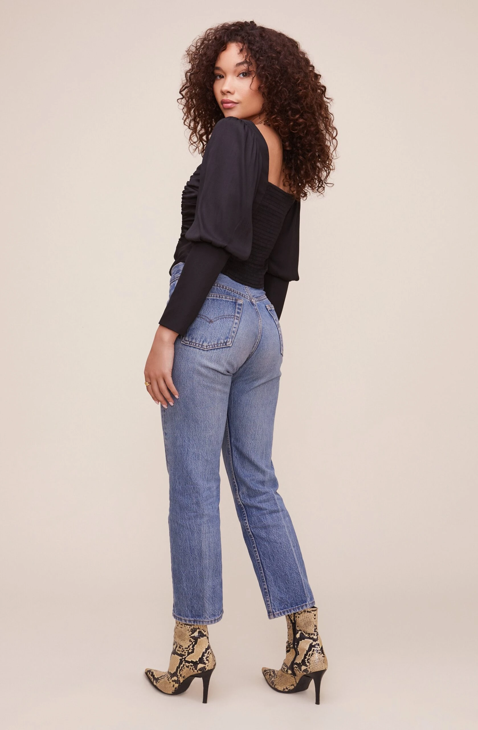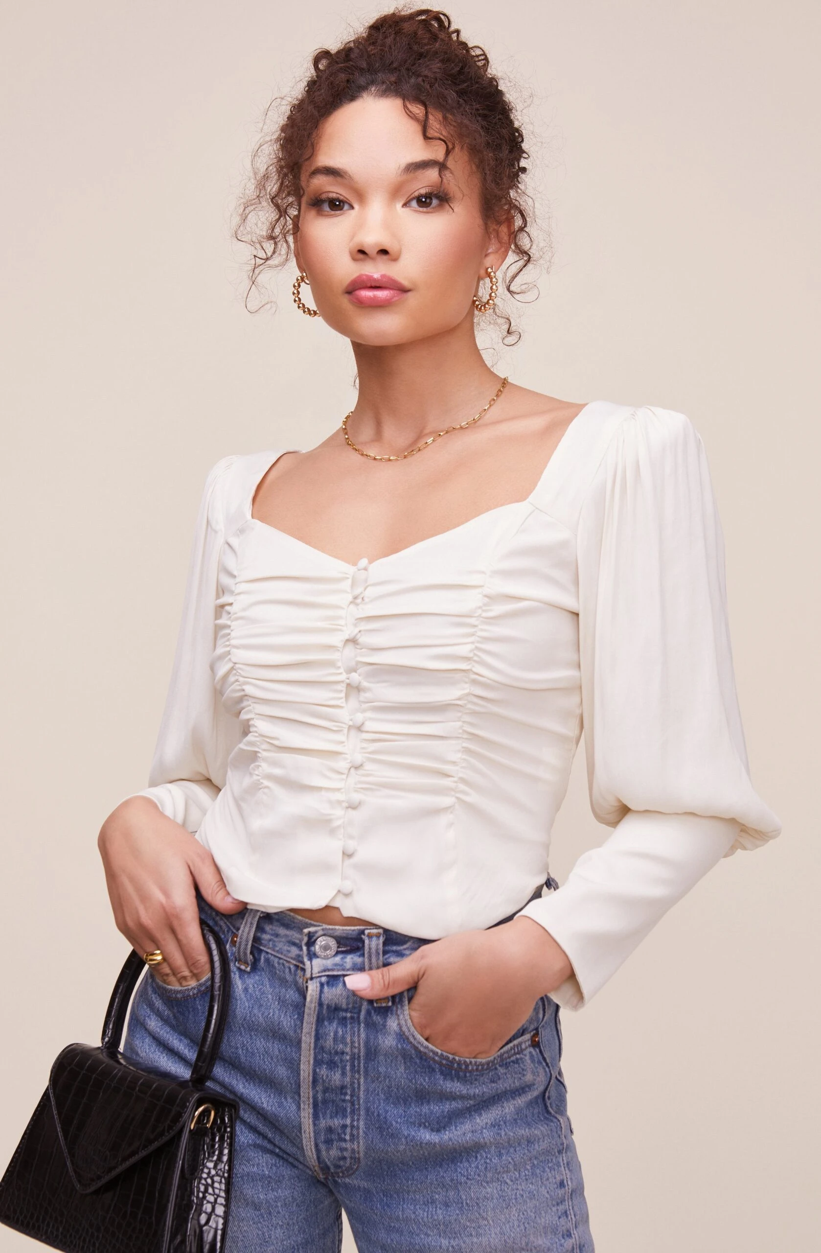 Reawaken your ensemble with the Renaissance Top! It features a square neckline that descends to a smocked bodice with front button accents. Long puff sleeves with exaggerated cuffs. Crop length.