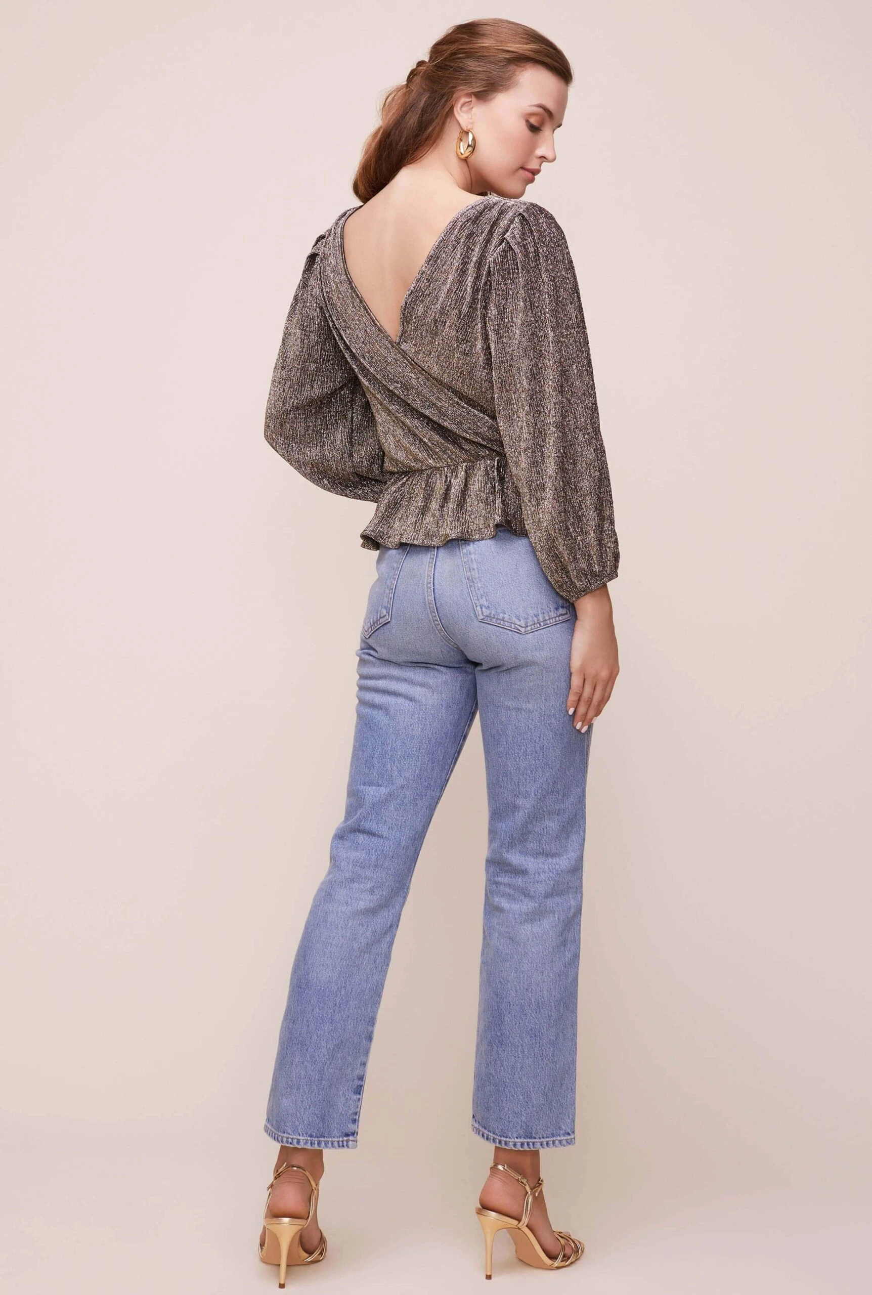 Chic and photo-ready! This dazzling metallic top features a V neckline that flows into a wrap front and cinched waist. Peplum hem accentuates the figure. Long sleeves.