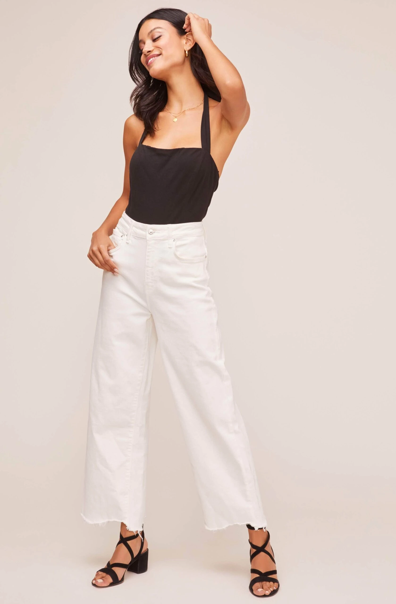 Vintage-inspired bodysuit starts with a square neckline supported by self-tie halter straps. Darted bodice that accentuates the silhouette and low-cut back. Smocked detailing.