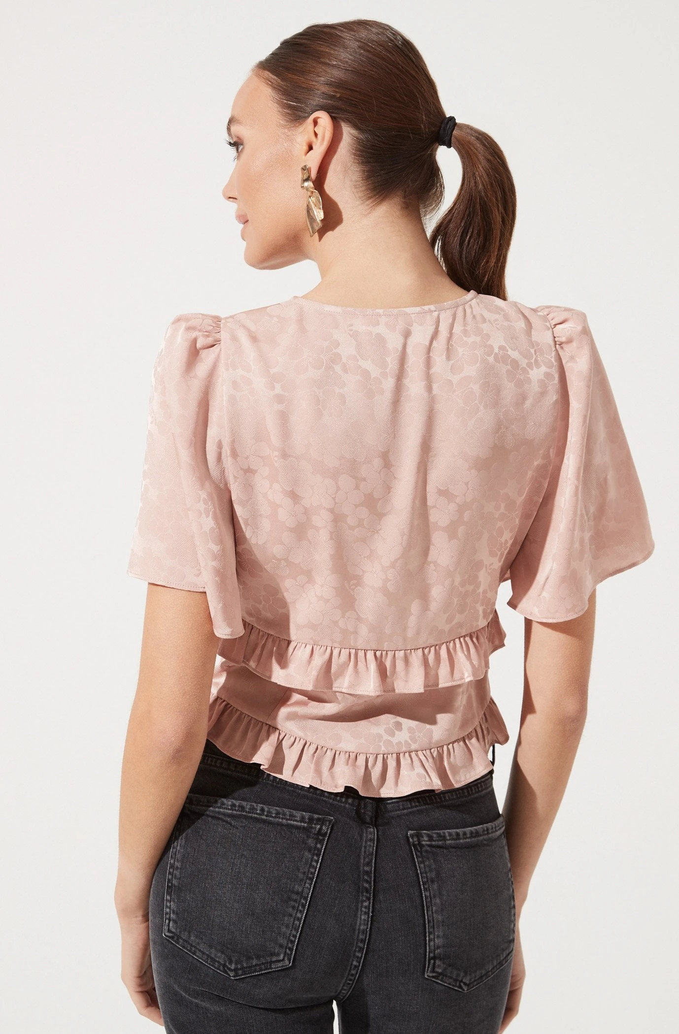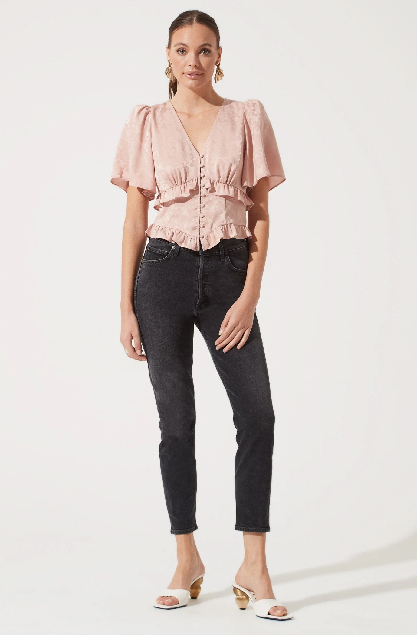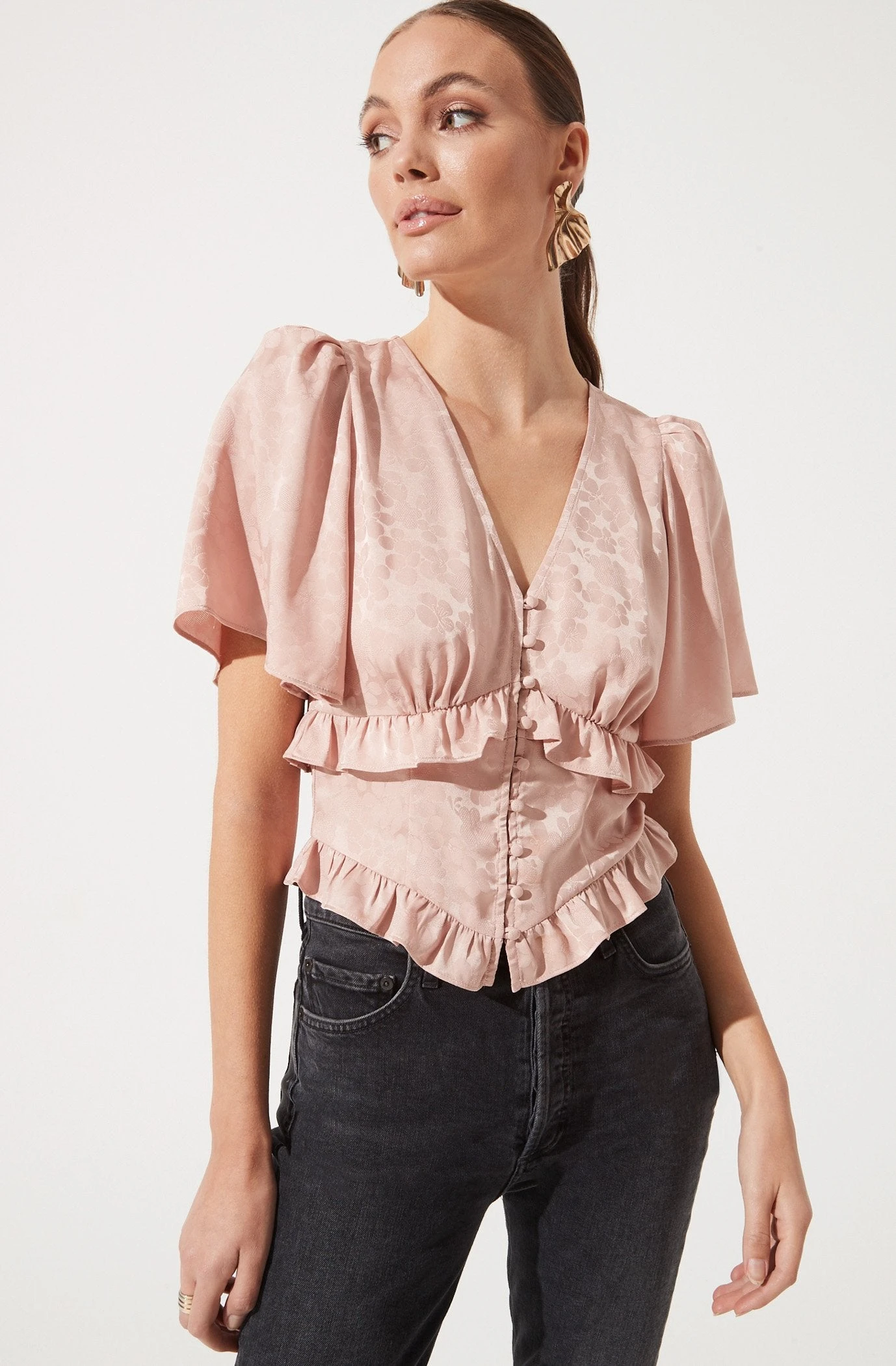 This statement top features short flutter sleeves with a V neckline that leads to a buttoned front. Ruffle trim along the bust and waist for added romance.