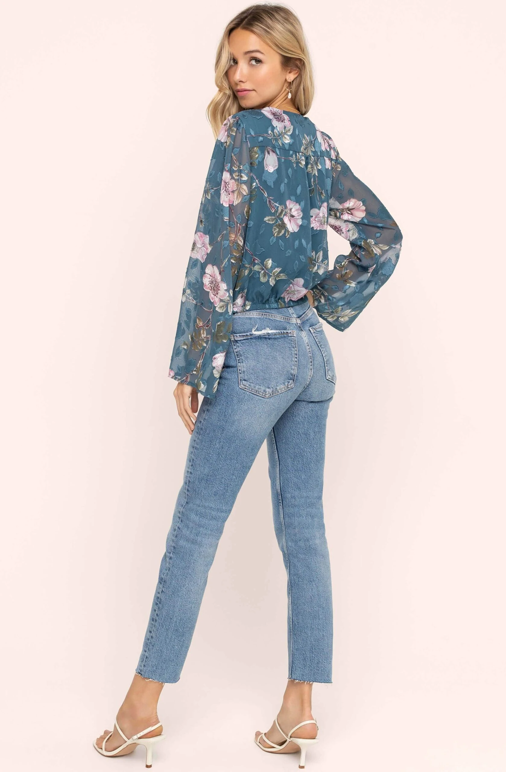This chic top features a floral print with a burnout finish. V neckline leads to a surplice front. Sheer long, bell sleeves. Elastic waist.