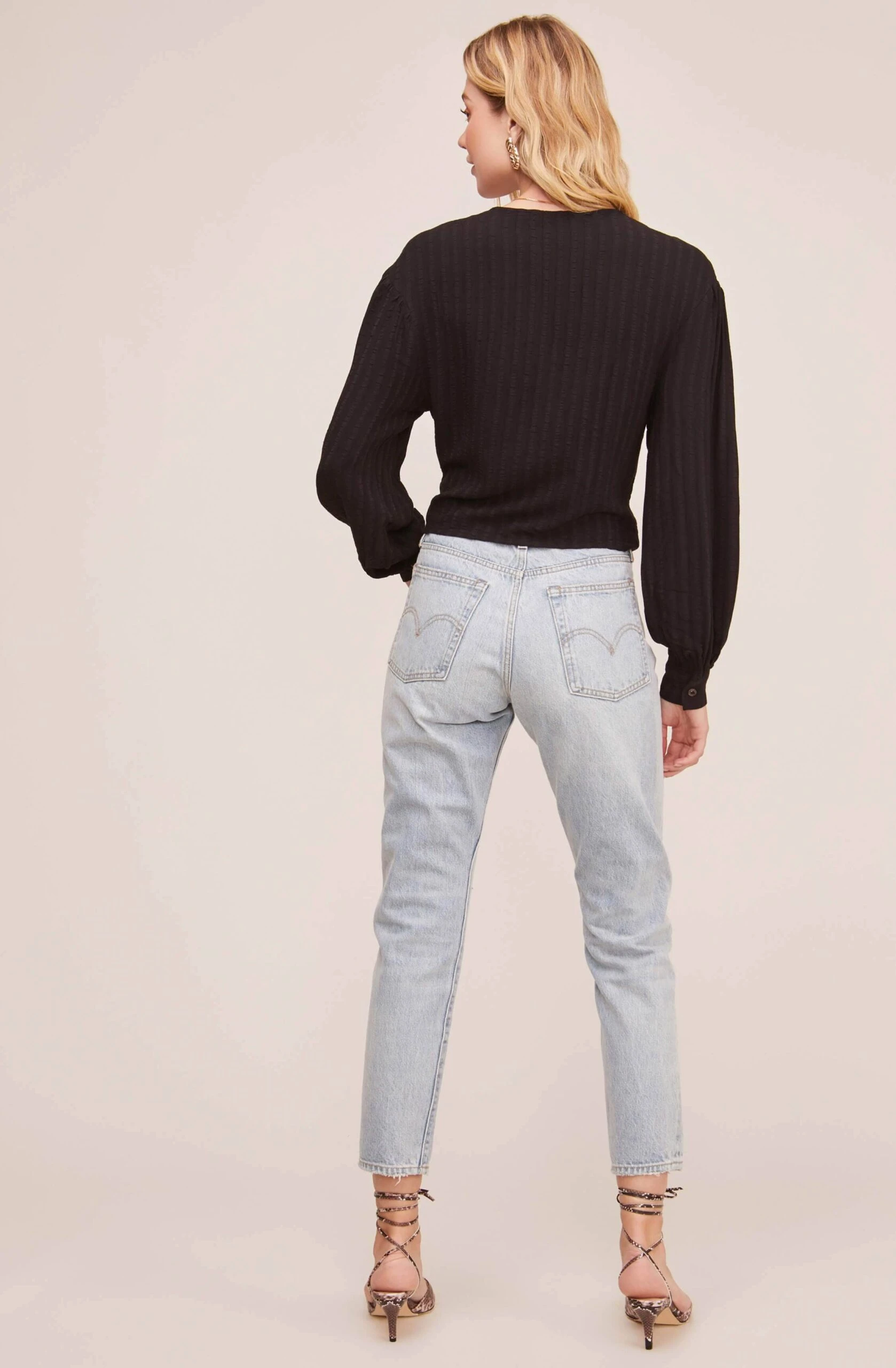 A flattering fit makes this knit top one of our faves! V neckline leads to a buttoned front. Ribbed knit construction adds interest and tie front accent keeps it casual. Long sleeves.