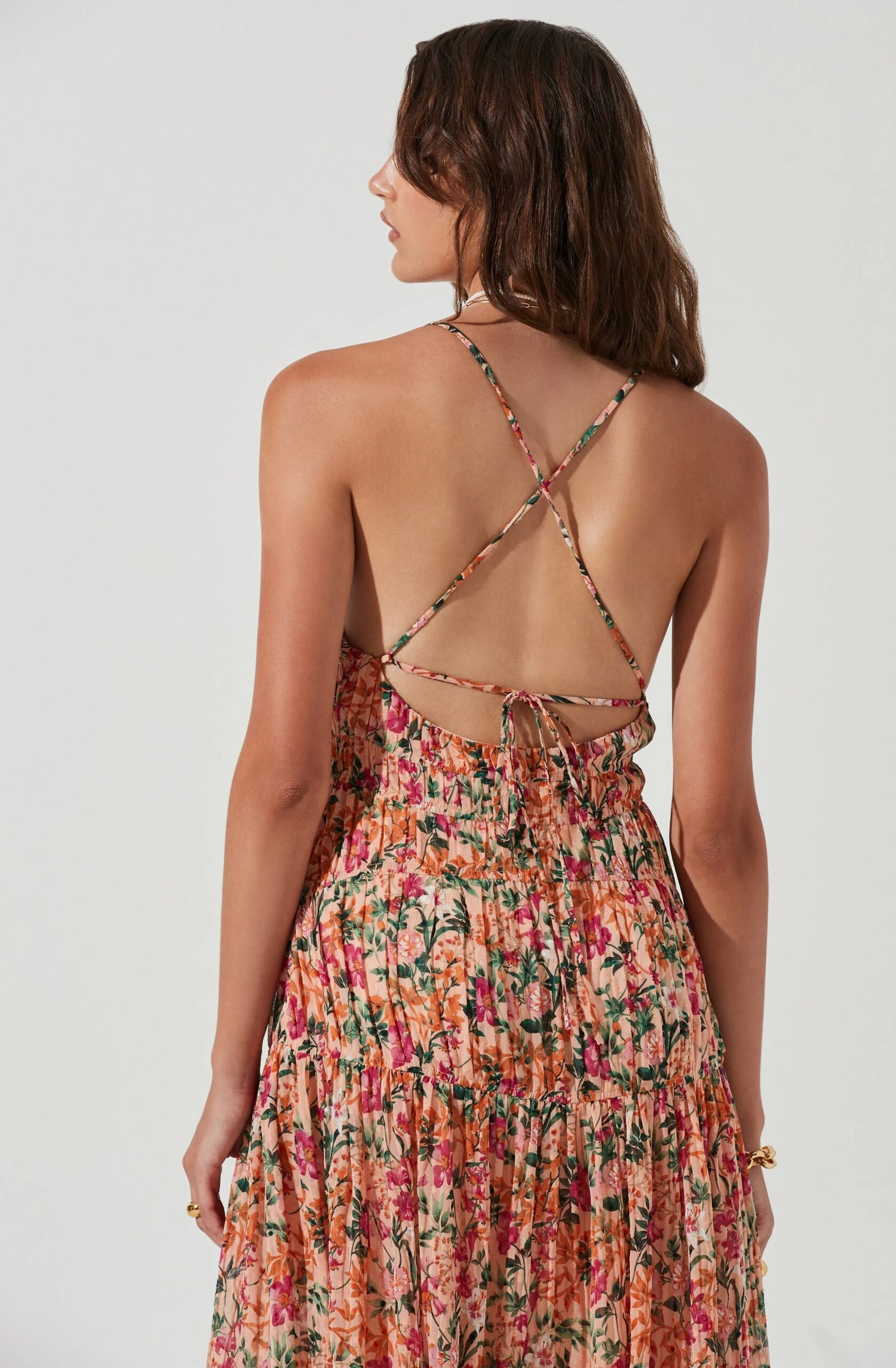 This statement occasion dress features a plunging neckline that leads to a front cutout accent at the bust. Flattering pleating throughout. Side slit accent. Open back with adjustable cross straps.