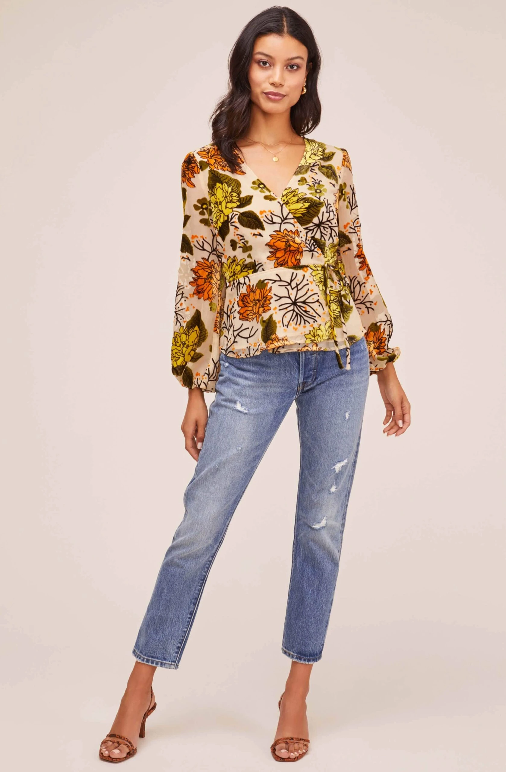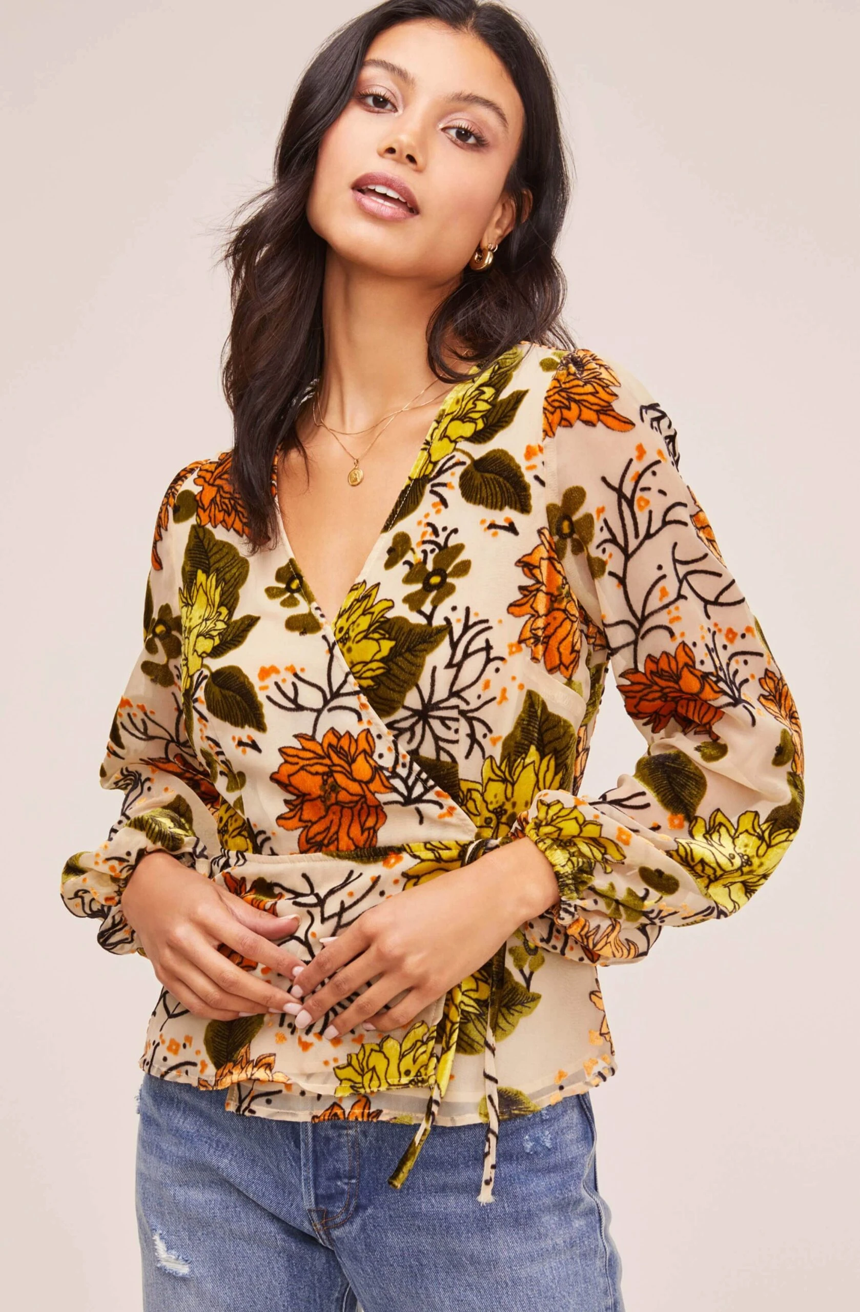 Bold colors set the tone for the Velvet Burnout Wrap Top. V neck descends to a wrapped bodice that meets at a defined waist with a side tie closure. Long puff sleeves and velvet burnout floral print details throughout. Slight flare hem.