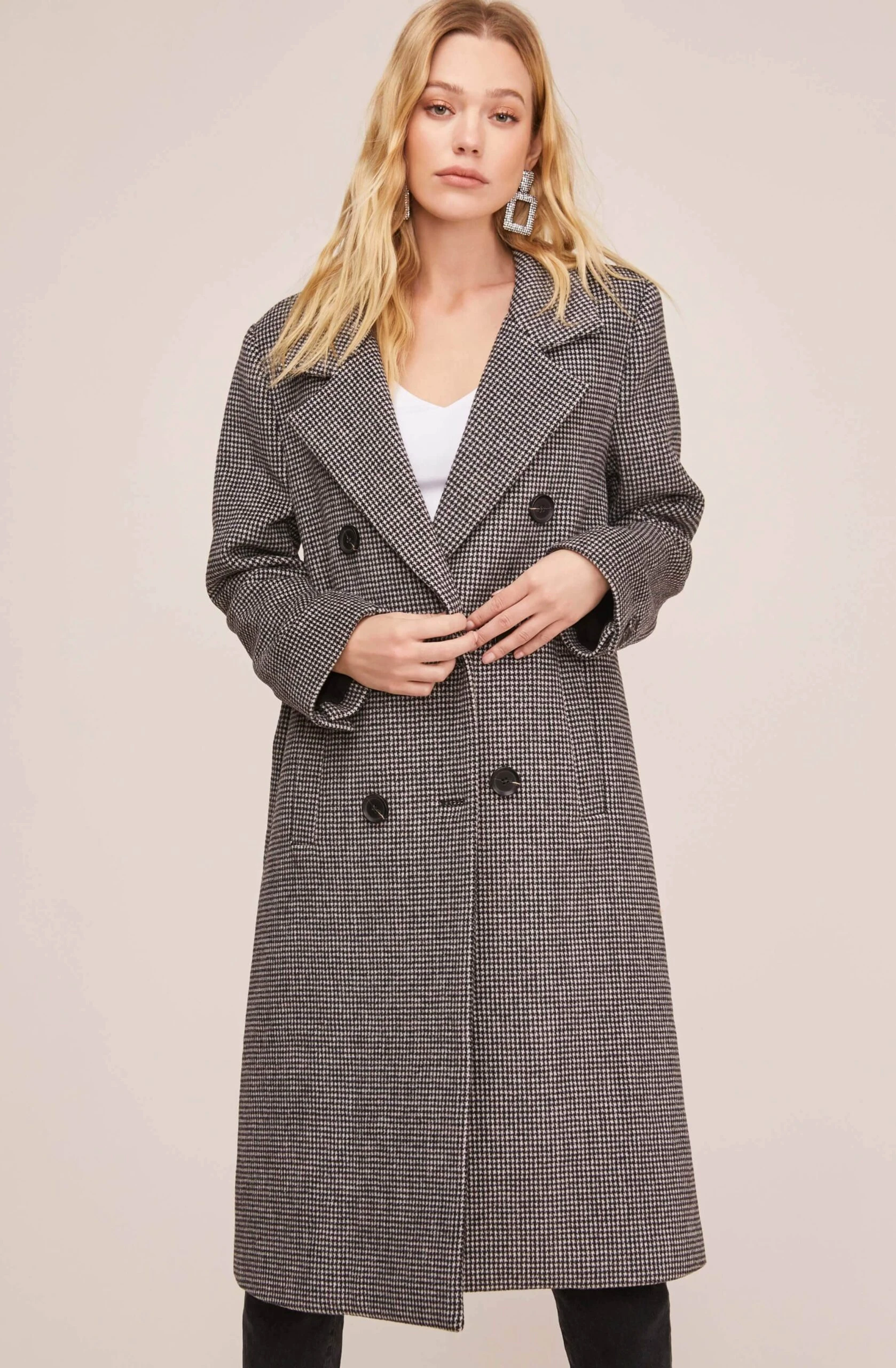 Take cover from the cold with the Vernon Houndstooth Coat. Longline silhouette leads to a statement notched lapel and double-breasted front. Double side pockets and long sleeves. Vented back.