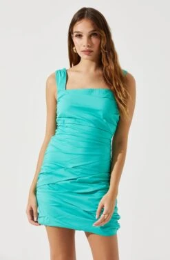 The Vilma Dress features a floral print. V neckline features a ruffle trim and leads to a ruched silhouette with ruffle trim. Short, flutter sleeves. Concealed back zip closure.