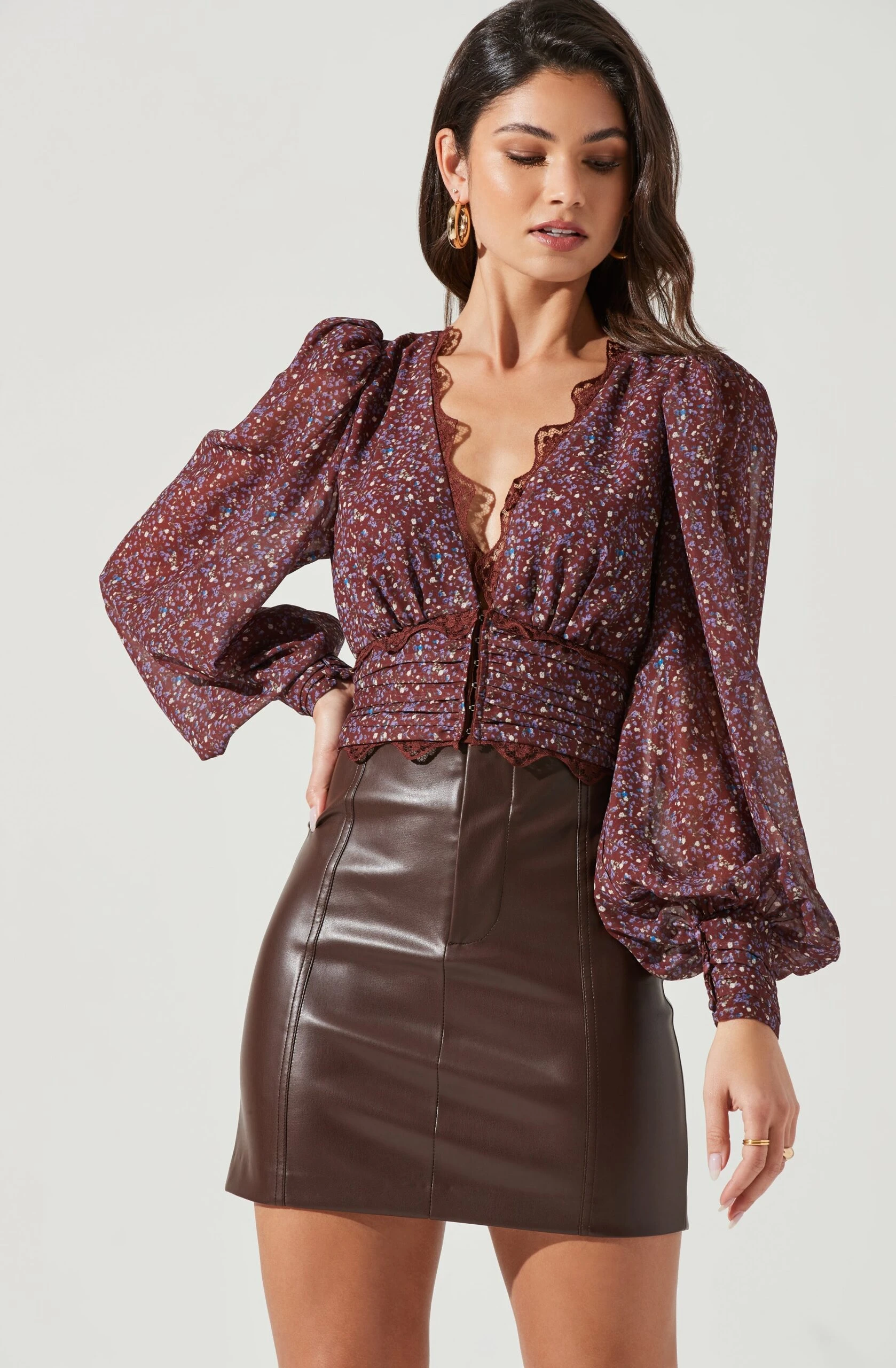 Automatically dressing up any outfit, the Zanna Top has it all. Featuring a ditzy floral print throughout, plunging V neckline boasts a delicate scalloped lace trim. Gathered bust leads to a ruched waist featuring an elevated hook-and-eye front closure. Lightly padded shoulders and oversized long sleeves with buttoned cuffs.